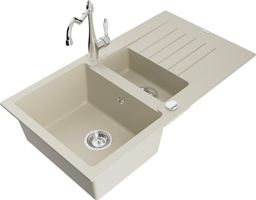 Technické dáta: drez: Rozmer: 900x505x200mm Hĺbka komory: 180 mm (väčšia), 115 mm (menšia) Rozmery komory: 435x335 mm (väčšie), 345x150 mm (menšie) Priemer odtoku: ø90 mm Typ: 1,5-komorový s krátkym odkvapkávačom Typ: Zapustené do pracovnej dosky Farba béžová Povrchová úprava sifónu: Chrome Materiál: žula (80% žulové kamenivo, 20% živice) Prepadový otvor: Áno Otvory: (batérie, automatické) 2 Inštalácia: Univerzálna, je možné inštalovať s odkvapkávačom na ľavú alebo pravú stranu Vysoká odolnosť proti poškriabaniu a zmene farby Odolnosť proti tepelným šokom Ľahko čistiteľný povrch Dva dodatočné vyfrézované otvory na samodierovanie ø35 kuchynská batéria: Materiál: mosadz Farba: Chrome Hlava: Keramická Prevzdušňovač: Áno Typ: Jedna páka Výška batérie: 290 mm Rozsah výtoku: 260 mm(GT) Ean: 5905315037749