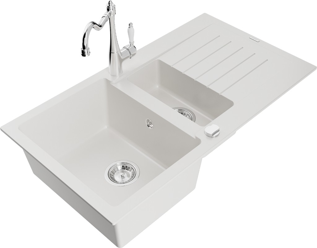 Technické dáta: drez: Rozmer: 900x505x200mm Hĺbka komory: 180 mm (väčšia), 115 mm (menšia) Rozmery komory: 435x335 mm (väčšie), 345x150 mm (menšie) Priemer odtoku: ø90 mm Typ: 1,5-komorový s krátkym odkvapkávačom Typ: Zapustené do pracovnej dosky biela farba Povrchová úprava sifónu: Chrome Materiál: žula (80% žulové kamenivo, 20% živice) Prepadový otvor: Áno Otvory: (batérie, automatické) 2 Inštalácia: Univerzálna, je možné inštalovať s odkvapkávačom na ľavú alebo pravú stranu Vysoká odolnosť proti poškriabaniu a zmene farby Odolnosť proti tepelným šokom Ľahko čistiteľný povrch Dva dodatočné vyfrézované otvory na samodierovanie ø35 kuchynská batéria: Materiál: mosadz Farba: Chrome Hlava: Keramická Prevzdušňovač: Áno Typ: Jedna páka Výška batérie: 290 mm Rozsah výtoku: 260 mm(GT) Ean: 5905315037701