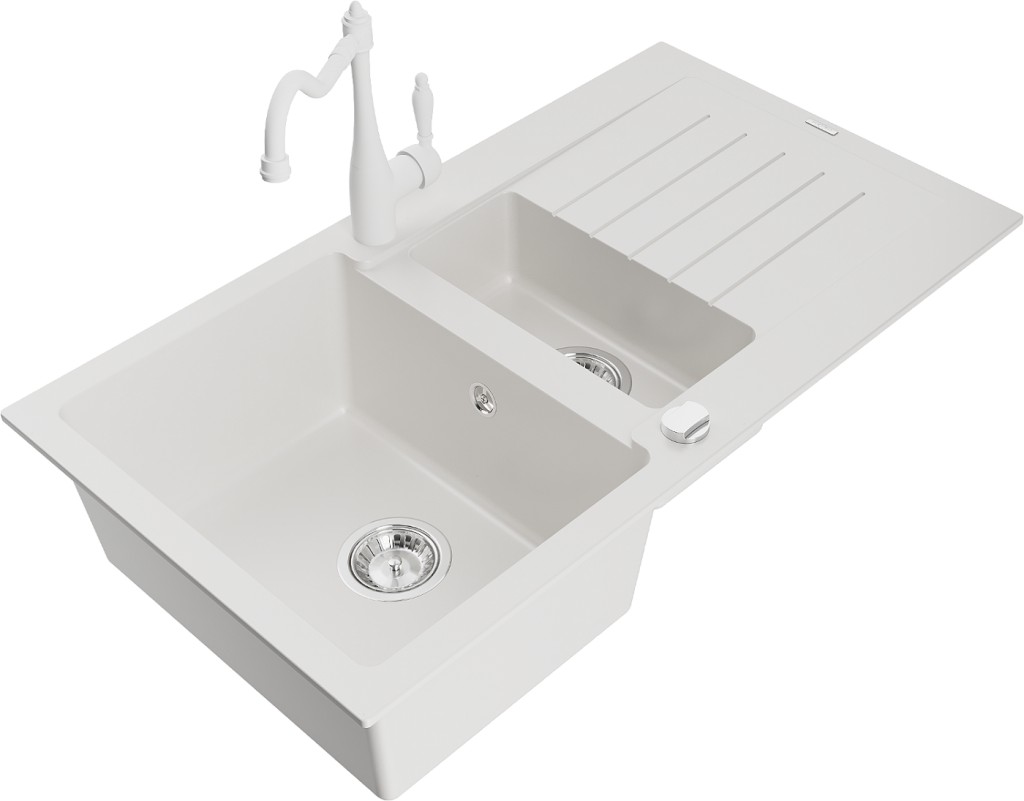 Technické dáta: drez: Rozmer: 900x505x200mm Hĺbka komory: 180 mm (väčšia), 115 mm (menšia) Rozmery komory: 435x335 mm (väčšie), 345x150 mm (menšie) Priemer odtoku: ø90 mm Typ: 1,5-komorový s krátkym odkvapkávačom Typ: Zapustené do pracovnej dosky biela farba Povrchová úprava sifónu: Chrome Materiál: žula (80% žulové kamenivo, 20% živice) Prepadový otvor: Áno Otvory: (batérie, automatické) 2 Inštalácia: Univerzálna, je možné inštalovať s odkvapkávačom na ľavú alebo pravú stranu Vysoká odolnosť proti poškriabaniu a zmene farby Odolnosť proti tepelným šokom Ľahko čistiteľný povrch Dva dodatočné vyfrézované otvory na samodierovanie ø35 kuchynská batéria: Materiál: mosadz biela farba Hlava: Keramická Prevzdušňovač: Áno Typ: Jedna páka Výška batérie: 290 mm Rozsah výtoku: 260 mm(GT) Ean: 5905315037718