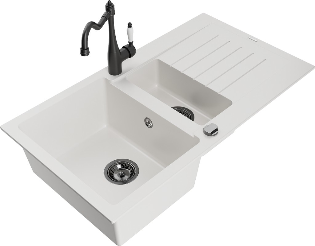 Technické dáta: drez: Rozmer: 900x505x200mm Hĺbka komory: 180 mm (väčšia), 115 mm (menšia) Rozmery komory: 435x335 mm (väčšie), 345x150 mm (menšie) Priemer odtoku: ø90 mm Typ: 1,5-komorový s krátkym odkvapkávačom Typ: Zapustené do pracovnej dosky biela farba Povrchová úprava sifónu: čierna Materiál: žula (80% žulové kamenivo, 20% živice) Prepadový otvor: Áno Otvory: (batérie, automatické) 2 Inštalácia: Univerzálna, je možné inštalovať s odkvapkávačom na ľavú alebo pravú stranu Vysoká odolnosť proti poškriabaniu a zmene farby Odolnosť proti tepelným šokom Ľahko čistiteľný povrch Dva dodatočné vyfrézované otvory na samodierovanie ø35 kuchynská batéria: Materiál: mosadz Čierna farba Hlava: Keramická Prevzdušňovač: Áno Typ: Jedna páka Výška batérie: 290 mm Rozsah výtoku: 260 mm(GT) Ean: 5905315037732