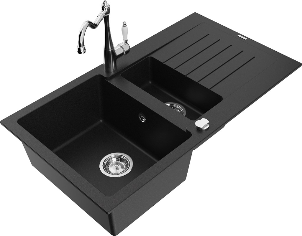 Technické dáta: drez: Rozmer: 900x505x200mm Hĺbka komory: 180 mm (väčšia), 115 mm (menšia) Rozmery komory: 435x335 mm (väčšie), 345x150 mm (menšie) Priemer odtoku: ø90 mm Typ: 1,5-komorový s krátkym odkvapkávačom Typ: Zapustené do pracovnej dosky Čierna farba Povrchová úprava sifónu: Chrome Materiál: žula (80% žulové kamenivo, 20% živice) Prepadový otvor: Áno Otvory: (batérie, automatické) 2 Inštalácia: Univerzálna, je možné inštalovať s odkvapkávačom na ľavú alebo pravú stranu Vysoká odolnosť proti poškriabaniu a zmene farby Odolnosť proti tepelným šokom Ľahko čistiteľný povrch Dva dodatočné vyfrézované otvory na samodierovanie ø35 kuchynská batéria: Materiál: mosadz Farba: Chrome Hlava: Keramická Prevzdušňovač: Áno Typ: Jedna páka Výška batérie: 290 mm Rozsah výtoku: 260 mm(GT) Ean: 5905315037978