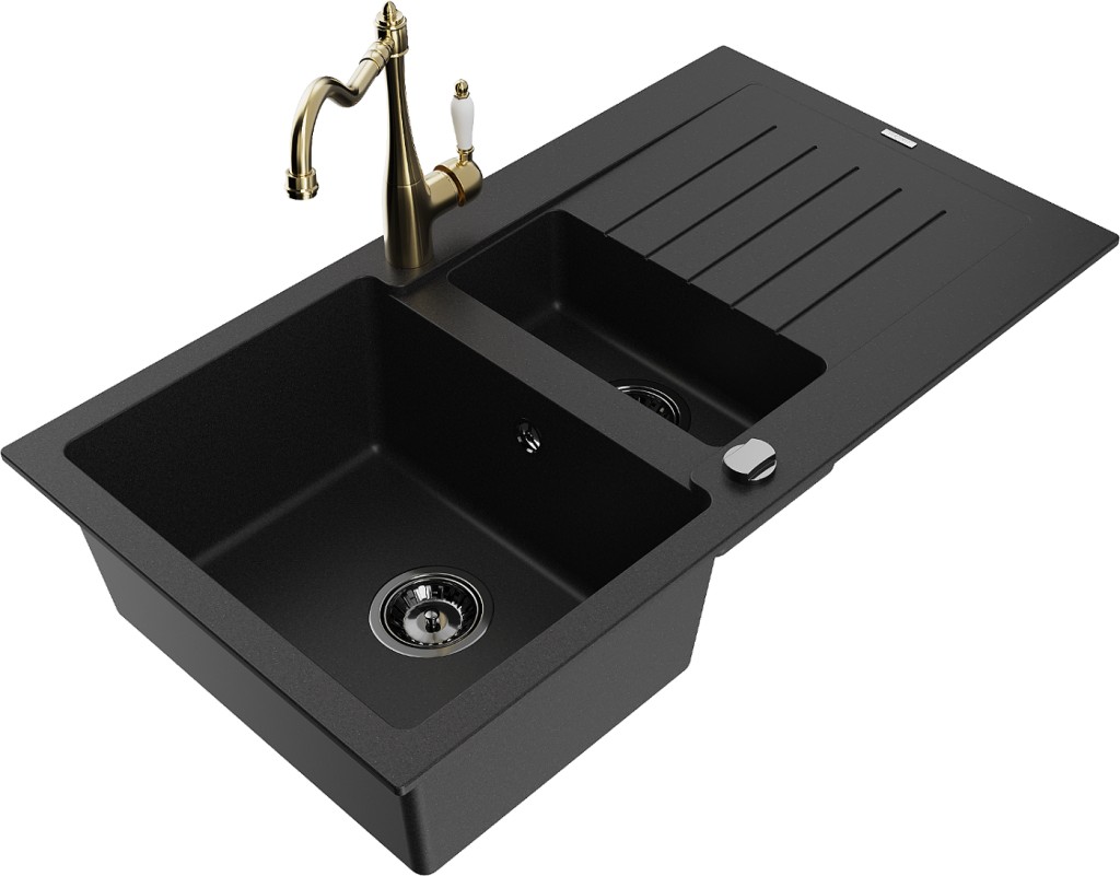 Technické dáta: drez: Rozmer: 900x505x200mm Hĺbka komory: 180 mm (väčšia), 115 mm (menšia) Rozmery komory: 435x335 mm (väčšie), 345x150 mm (menšie) Priemer odtoku: ø90 mm Typ: 1,5-komorový s krátkym odkvapkávačom Typ: Zapustené do pracovnej dosky Čierna farba Povrchová úprava sifónu: čierna Materiál: žula (80% žulové kamenivo, 20% živice) Prepadový otvor: Áno Otvory: (batérie, automatické) 2 Inštalácia: Univerzálna, je možné inštalovať s odkvapkávačom na ľavú alebo pravú stranu Vysoká odolnosť proti poškriabaniu a zmene farby Odolnosť proti tepelným šokom Ľahko čistiteľný povrch Dva dodatočné vyfrézované otvory na samodierovanie ø35 kuchynská batéria: Materiál: mosadz Farba: Zlatá Hlava: Keramická Prevzdušňovač: Áno Typ: Jedna páka Výška batérie: 290 mm Rozsah výtoku: 260 mm(GT) Ean: 5905315037992