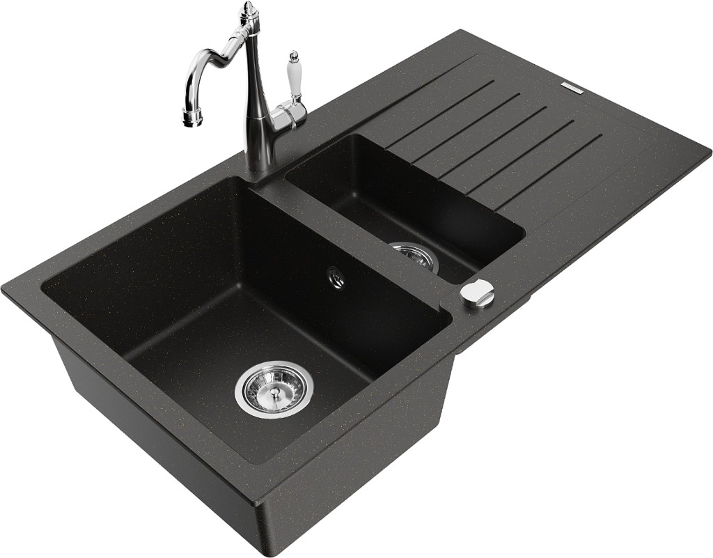 Technické dáta: drez: Rozmer: 900x505x200mm Hĺbka komory: 180 mm (väčšia), 115 mm (menšia) Rozmery komory: 435x335 mm (väčšie), 345x150 mm (menšie) Priemer odtoku: ø90 mm Typ: 1,5-komorový s krátkym odkvapkávačom Typ: Zapustené do pracovnej dosky Farba: čierna / zlatá metalíza Povrchová úprava sifónu: Chrome Materiál: žula (80% žulové kamenivo, 20% živice) Prepadový otvor: Áno Otvory: (batérie, automatické) 2 Inštalácia: Univerzálna, je možné inštalovať s odkvapkávačom na ľavú alebo pravú stranu Vysoká odolnosť proti poškriabaniu a zmene farby Odolnosť proti tepelným šokom Ľahko čistiteľný povrch Dva dodatočné vyfrézované otvory na samodierovanie ø35 kuchynská batéria: Materiál: mosadz Farba: Chrome Hlava: Keramická Prevzdušňovač: Áno Typ: Jedna páka Výška batérie: 290 mm Rozsah výtoku: 260 mm(GT) Ean: 5905315037886