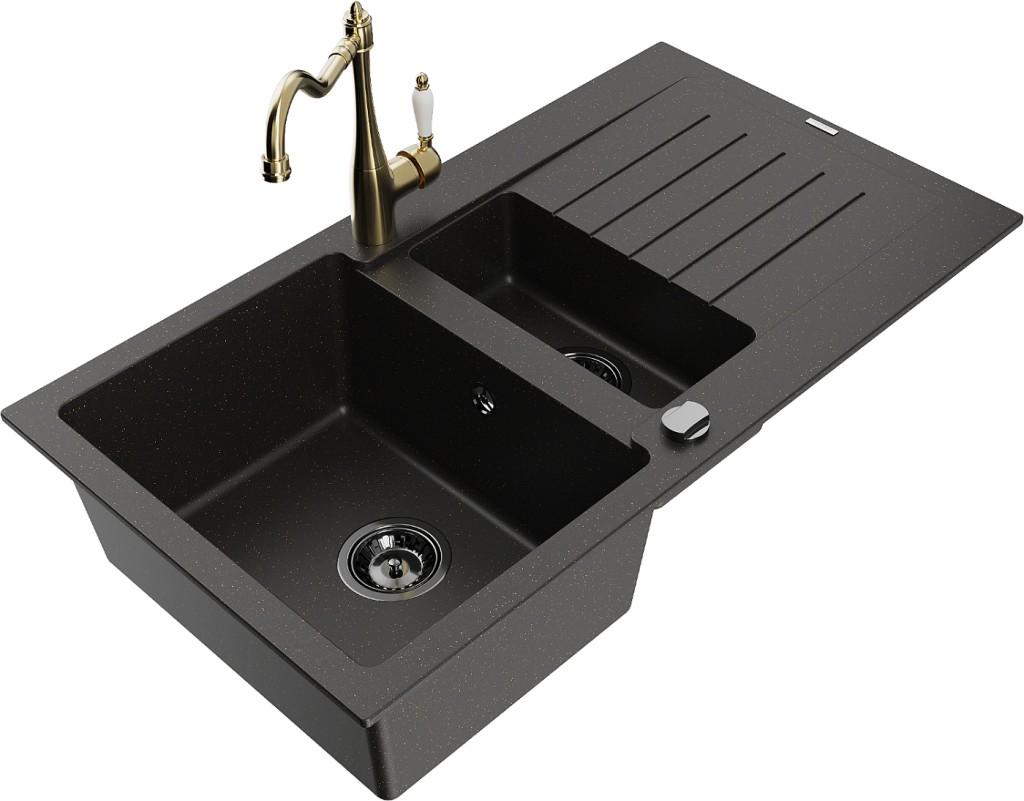 Technické dáta: drez: Rozmer: 900x505x200mm Hĺbka komory: 180 mm (väčšia), 115 mm (menšia) Rozmery komory: 435x335 mm (väčšie), 345x150 mm (menšie) Priemer odtoku: ø90 mm Typ: 1,5-komorový s krátkym odkvapkávačom Typ: Zapustené do pracovnej dosky Farba: čierna / zlatá metalíza Povrchová úprava sifónu: čierna Materiál: žula (80% žulové kamenivo, 20% živice) Prepadový otvor: Áno Otvory: (batérie, automatické) 2 Inštalácia: Univerzálna, je možné inštalovať s odkvapkávačom na ľavú alebo pravú stranu Vysoká odolnosť proti poškriabaniu a zmene farby Odolnosť proti tepelným šokom Ľahko čistiteľný povrch Dva dodatočné vyfrézované otvory na samodierovanie ø35 kuchynská batéria: Materiál: mosadz Farba: Zlatá Hlava: Keramická Prevzdušňovač: Áno Typ: Jedna páka Výška batérie: 290 mm Rozsah výtoku: 260 mm(GT) Ean: 5905315037893