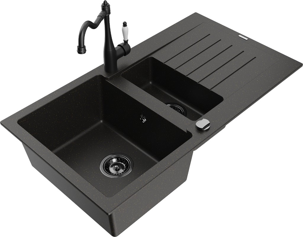 Technické dáta: drez: Rozmer: 900x505x200mm Hĺbka komory: 180 mm (väčšia), 115 mm (menšia) Rozmery komory: 435x335 mm (väčšie), 345x150 mm (menšie) Priemer odtoku: ø90 mm Typ: 1,5-komorový s krátkym odkvapkávačom Typ: Zapustené do pracovnej dosky Farba: čierna / zlatá metalíza Povrchová úprava sifónu: čierna Materiál: žula (80% žulové kamenivo, 20% živice) Prepadový otvor: Áno Otvory: (batérie, automatické) 2 Inštalácia: Univerzálna, je možné inštalovať s odkvapkávačom na ľavú alebo pravú stranu Vysoká odolnosť proti poškriabaniu a zmene farby Odolnosť proti tepelným šokom Ľahko čistiteľný povrch Dva dodatočné vyfrézované otvory na samodierovanie ø35 kuchynská batéria: Materiál: mosadz Čierna farba Hlava: Keramická Prevzdušňovač: Áno Typ: Jedna páka Výška batérie: 290 mm Rozsah výtoku: 260 mm(GT) Ean: 5905315037916