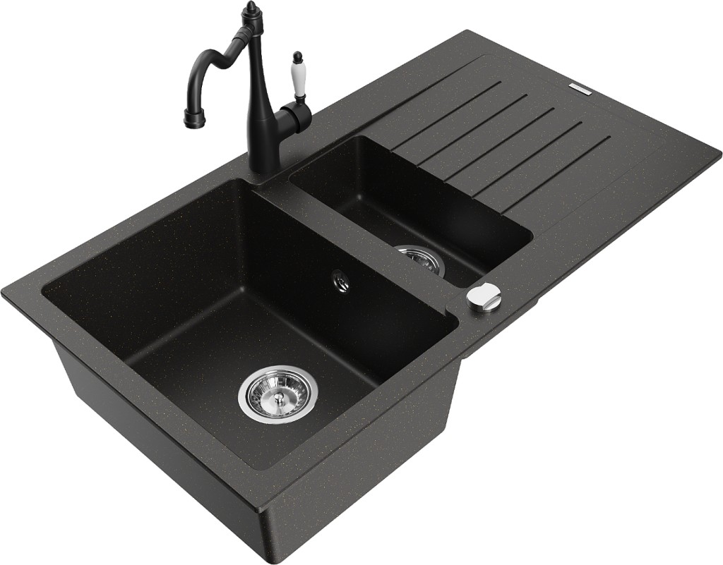 Technické dáta: drez: Rozmer: 900x505x200mm Hĺbka komory: 180 mm (väčšia), 115 mm (menšia) Rozmery komory: 435x335 mm (väčšie), 345x150 mm (menšie) Priemer odtoku: ø90 mm Typ: 1,5-komorový s krátkym odkvapkávačom Typ: Zapustené do pracovnej dosky Farba: čierna / zlatá metalíza Povrchová úprava sifónu: Chrome Materiál: žula (80% žulové kamenivo, 20% živice) Prepadový otvor: Áno Otvory: (batérie, automatické) 2 Inštalácia: Univerzálna, je možné inštalovať s odkvapkávačom na ľavú alebo pravú stranu Vysoká odolnosť proti poškriabaniu a zmene farby Odolnosť proti tepelným šokom Ľahko čistiteľný povrch Dva dodatočné vyfrézované otvory na samodierovanie ø35 kuchynská batéria: Materiál: mosadz Čierna farba Hlava: Keramická Prevzdušňovač: Áno Typ: Jedna páka Výška batérie: 290 mm Rozsah výtoku: 260 mm(GT) Ean: 5905315037909
