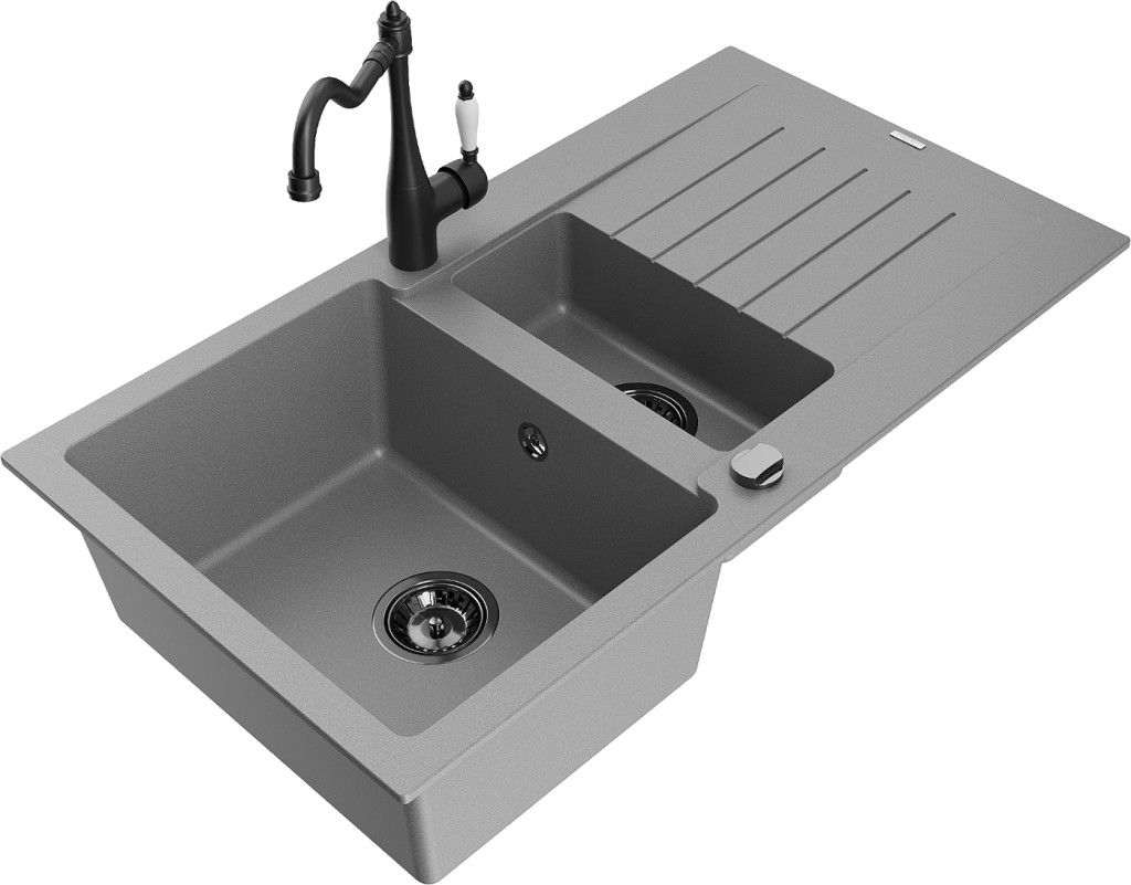 Technické dáta: drez: Rozmer: 900x505x200mm Hĺbka komory: 180 mm (väčšia), 115 mm (menšia) Rozmery komory: 435x335 mm (väčšie), 345x150 mm (menšie) Priemer odtoku: ø90 mm Typ: 1,5-komorový s krátkym odkvapkávačom Typ: Zapustené do pracovnej dosky Šedá farba Povrchová úprava sifónu: čierna Materiál: žula (80% žulové kamenivo, 20% živice) Prepadový otvor: Áno Otvory: (batérie, automatické) 2 Inštalácia: Univerzálna, je možné inštalovať s odkvapkávačom na ľavú alebo pravú stranu Vysoká odolnosť proti poškriabaniu a zmene farby Odolnosť proti tepelným šokom Ľahko čistiteľný povrch Dva dodatočné vyfrézované otvory na samodierovanie ø35 kuchynská batéria: Materiál: mosadz Čierna farba Hlava: Keramická Prevzdušňovač: Áno Typ: Jedna páka Výška batérie: 290 mm Rozsah výtoku: 260 mm(GT) Ean: 5905315037817