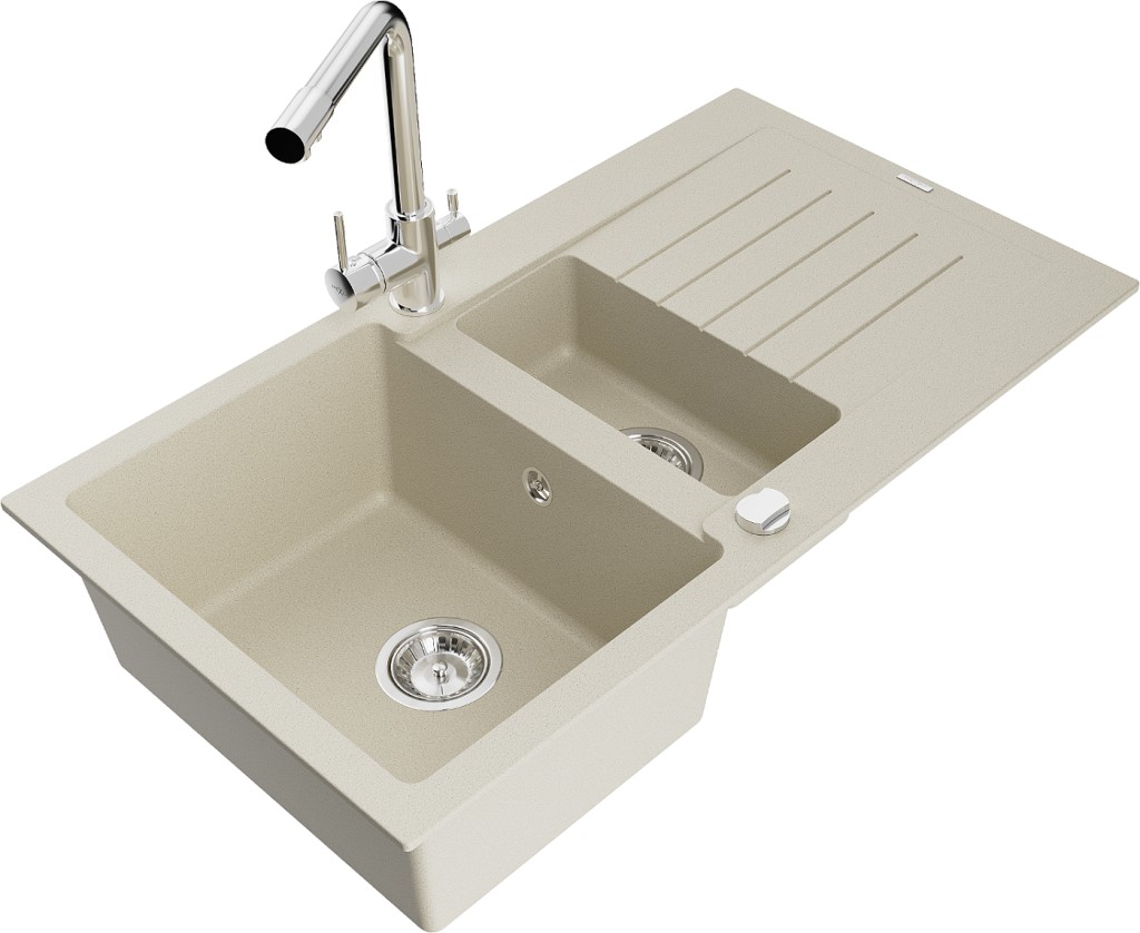 Technické dáta: drez: Rozmer: 900x505x200mm Hĺbka komory: 180 mm (väčšia), 115 mm (menšia) Rozmery komory: 435x335 mm (väčšie), 345x150 mm (menšie) Priemer odtoku: ø90 mm Typ: 1,5-komorový s krátkym odkvapkávačom Typ: Zapustené do pracovnej dosky Farba béžová Povrchová úprava sifónu: Chrome Materiál: žula (80% žulové kamenivo, 20% živice) Prepadový otvor: Áno Otvory: (batérie, automatické) 2 Inštalácia: Univerzálna, je možné inštalovať s odkvapkávačom na ľavú alebo pravú stranu Vysoká odolnosť proti poškriabaniu a zmene farby Odolnosť proti tepelným šokom Ľahko čistiteľný povrch Dva dodatočné vyfrézované otvory na samodierovanie ø35 kuchynská batéria: Materiál: mosadz Farba: Chrome Hlava: Keramická Prevzdušňovač: Áno Typ: Dve rukoväte Rozsah výtoku: 235 mm Výška batérie: 315 mm Dvojhlavá batéria s prídavným kanálom pre filtrovanú pitnú vodu (GT) Ean: 5905315022370