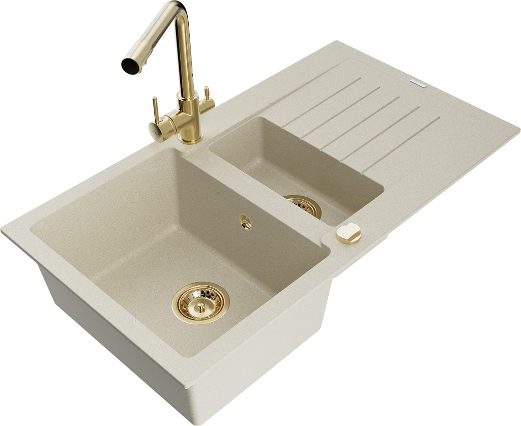 Technické dáta: drez: Rozmer: 900x505x200mm Hĺbka komory: 180 mm (väčšia), 115 mm (menšia) Rozmery komory: 435x335 mm (väčšie), 345x150 mm (menšie) Priemer odtoku: ø90 mm Typ: 1,5-komorový s krátkym odkvapkávačom Typ: Zapustené do pracovnej dosky Farba béžová Povrchová úprava sifónu: zlatá Materiál: žula (80% žulové kamenivo, 20% živice) Prepadový otvor: Áno Otvory: (batérie, automatické) 2 Inštalácia: Univerzálna, je možné inštalovať s odkvapkávačom na ľavú alebo pravú stranu Vysoká odolnosť proti poškriabaniu a zmene farby Odolnosť proti tepelným šokom Ľahko čistiteľný povrch Dva dodatočné vyfrézované otvory na samodierovanie ø35 kuchynská batéria: Materiál: mosadz Farba: Zlatá Hlava: Keramická Prevzdušňovač: Áno Typ: Dve rukoväte Rozsah výtoku: 235 mm Výška batérie: 315 mm Dvojhlavá batéria s prídavným kanálom pre filtrovanú pitnú vodu(GT) Ean: 5905315022394