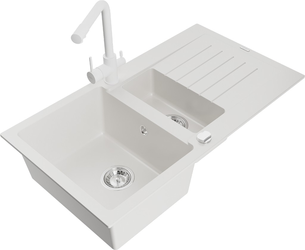 Technické dáta: drez: Rozmer: 900x505x200mm Hĺbka komory: 180 mm (väčšia), 115 mm (menšia) Rozmery komory: 435x335 mm (väčšie), 345x150 mm (menšie) Priemer odtoku: ø90 mm Typ: 1,5-komorový s krátkym odkvapkávačom Typ: Zapustené do pracovnej dosky biela farba Povrchová úprava sifónu: Chrome Materiál: žula (80% žulové kamenivo, 20% živice) Prepadový otvor: Áno Otvory: (batérie, automatické) 2 Inštalácia: Univerzálna, je možné inštalovať s odkvapkávačom na ľavú alebo pravú stranu Vysoká odolnosť proti poškriabaniu a zmene farby Odolnosť proti tepelným šokom Ľahko čistiteľný povrch Dva dodatočné vyfrézované otvory na samodierovanie ø35 kuchynská batéria: Materiál: mosadz biela farba Hlava: Keramická Prevzdušňovač: Áno Typ: Dve rukoväte Rozsah výtoku: 235 mm Výška batérie: 315 mm Dvojhlavá batéria s prídavným kanálom pre filtrovanú pitnú vodu(GT) Ean: 5905315022349