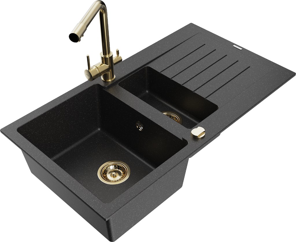 Technické dáta: drez: Rozmer: 900x505x200mm Hĺbka komory: 180 mm (väčšia), 115 mm (menšia) Rozmery komory: 435x335 mm (väčšie), 345x150 mm (menšie) Priemer odtoku: ø90 mm Typ: 1,5-komorový s krátkym odkvapkávačom Typ: Zapustené do pracovnej dosky Farba: čierna/strieborná metalíza Povrchová úprava sifónu: zlatá Materiál: žula (80% žulové kamenivo, 20% živice) Prepadový otvor: Áno Otvory: (batérie, automatické) 2 Inštalácia: Univerzálna, je možné inštalovať s odkvapkávačom na ľavú alebo pravú stranu Vysoká odolnosť proti poškriabaniu a zmene farby Odolnosť proti tepelným šokom Ľahko čistiteľný povrch Dva dodatočné vyfrézované otvory na samodierovanie ø35 kuchynská batéria: Materiál: mosadz Farba: Zlatá Hlava: Keramická Prevzdušňovač: Áno Typ: Dve rukoväte Rozsah výtoku: 235 mm Výška batérie: 315 mm Dvojhlavá batéria s prídavným kanálom pre filtrovanú pitnú vodu(GT) Ean: 5905315022479