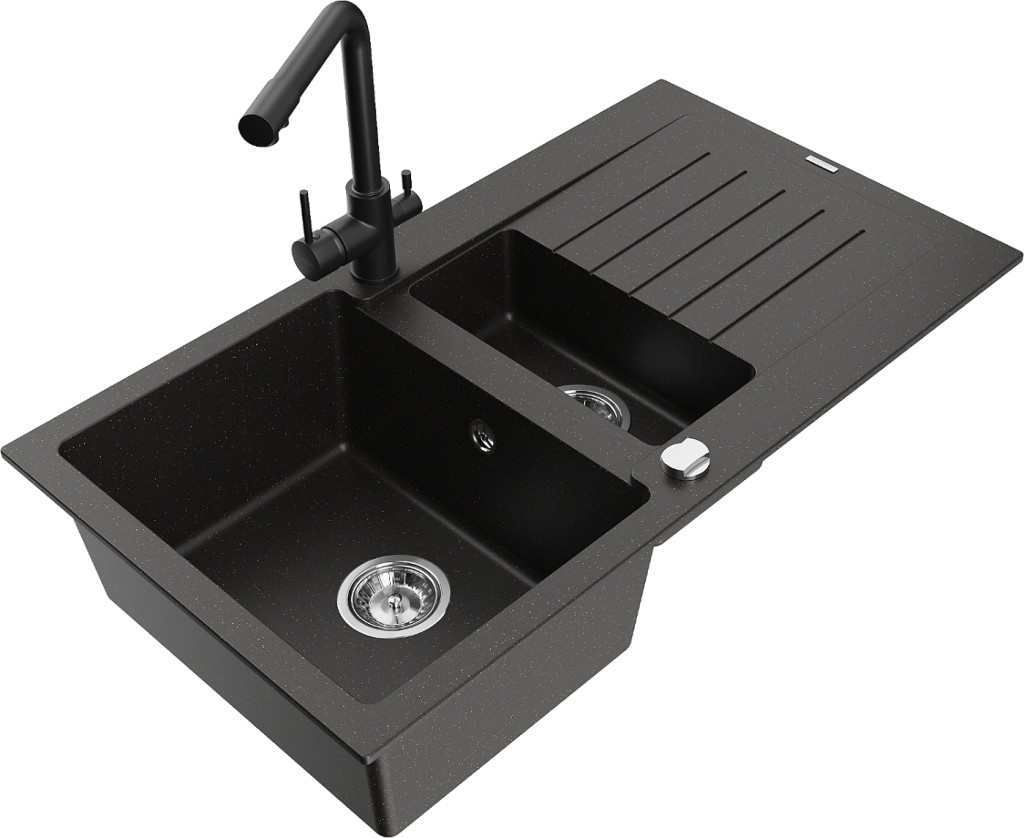 Technické dáta: drez: Rozmer: 900x505x200mm Hĺbka komory: 180 mm (väčšia), 115 mm (menšia) Rozmery komory: 435x335 mm (väčšie), 345x150 mm (menšie) Priemer odtoku: ø90 mm Typ: 1,5-komorový s krátkym odkvapkávačom Typ: Zapustené do pracovnej dosky Farba: čierna / zlatá metalíza Povrchová úprava sifónu: Chrome Materiál: žula (80% žulové kamenivo, 20% živice) Prepadový otvor: Áno Otvory: (batérie, automatické) 2 Inštalácia: Univerzálna, je možné inštalovať s odkvapkávačom na ľavú alebo pravú stranu Vysoká odolnosť proti poškriabaniu a zmene farby Odolnosť proti tepelným šokom Ľahko čistiteľný povrch Dva dodatočné vyfrézované otvory na samodierovanie ø35 kuchynská batéria: Materiál: mosadz Čierna farba Hlava: Keramická Prevzdušňovač: Áno Typ: Dve rukoväte Rozsah výtoku: 235 mm Výška batérie: 315 mm Dvojhlavá batéria s prídavným kanálom pre filtrovanú pitnú vodu(GT) Ean: 5905315022530