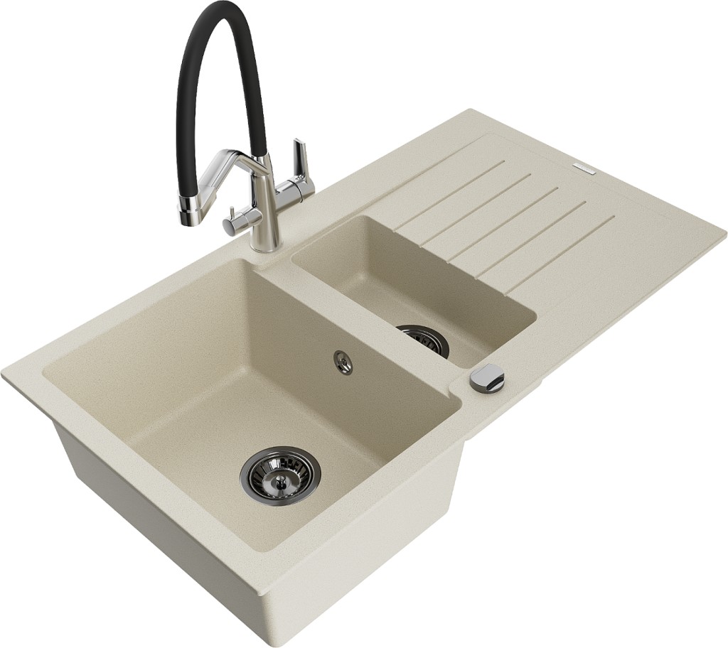Technické dáta: drez: Rozmer: 900x505x200mm Hĺbka komory: 180 mm (väčšia), 115 mm (menšia) Rozmery komory: 435x335 mm (väčšie), 345x150 mm (menšie) Priemer odtoku: ø90 mm Typ: 1,5-miska s krátkym odkvapkávačom Typ: Zapustené do pracovnej dosky Farba béžová Povrchová úprava sifónu: čierna Materiál: žula (80% žulové kamenivo, 20% živice) Prepadový otvor: Áno Otvory: (batérie, automatické) 2 Inštalácia: Univerzálna, je možné inštalovať s odkvapkávačom na ľavú alebo pravú stranu Vysoká odolnosť proti poškriabaniu a zmene farby Odolnosť proti tepelným šokom Ľahko čistiteľný povrch Dva dodatočné vyfrézované otvory na samodierovanie ø35 kuchynská batéria: Materiál: mosadz Povrchová úprava: chróm / čierna Hlavy: Keramické Prevzdušňovač: Áno Typ hubica: Flexibilný s mosadzným držiakom Rozsah výtoku: 260 mm Výška: 405 mm Typ: Dve rukoväte Dvojhlavá batéria s prídavným kanálom pre filtrovanú pitnú vodu(GT) Ean: 5905315049735