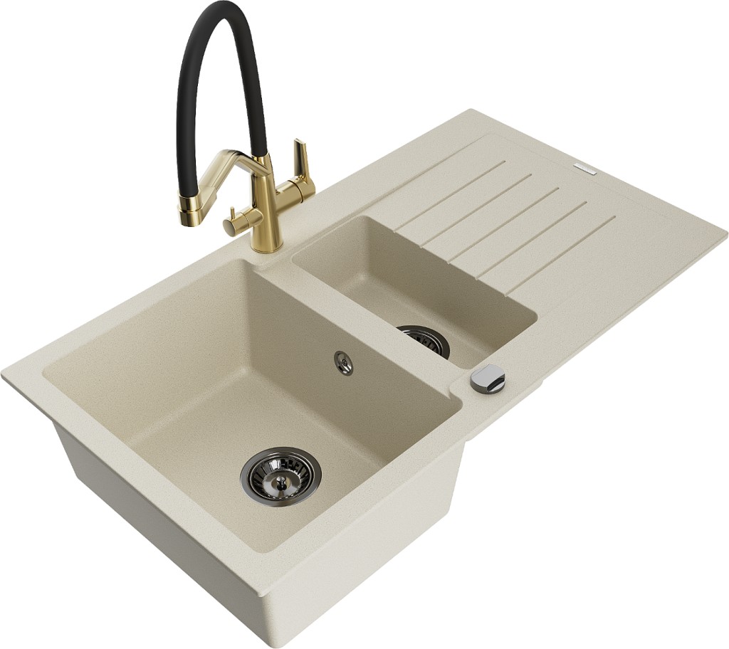 Technické dáta: drez: Rozmer: 900x505x200mm Hĺbka komory: 180 mm (väčšia), 115 mm (menšia) Rozmery komory: 435x335 mm (väčšie), 345x150 mm (menšie) Priemer odtoku: ø90 mm Typ: 1,5-miska s krátkym odkvapkávačom Typ: Zapustené do pracovnej dosky Farba béžová Povrchová úprava sifónu: čierna Materiál: žula (80% žulové kamenivo, 20% živice) Prepadový otvor: Áno Otvory: (batérie, automatické) 2 Inštalácia: Univerzálna, je možné inštalovať s odkvapkávačom na ľavú alebo pravú stranu Vysoká odolnosť proti poškriabaniu a zmene farby Odolnosť proti tepelným šokom Ľahko čistiteľný povrch Dva dodatočné vyfrézované otvory na samodierovanie ø35 kuchynská batéria: Materiál: mosadz Povrchová úprava: zlatá/čierna Hlavy: Keramické Prevzdušňovač: Áno Typ hubica: Flexibilný s mosadzným držiakom Rozsah výtoku: 260 mm Výška: 405 mm Typ: Dve rukoväte Dvojhlavá batéria s prídavným kanálom pre filtrovanú pitnú vodu(GT) Ean: 5905315049759