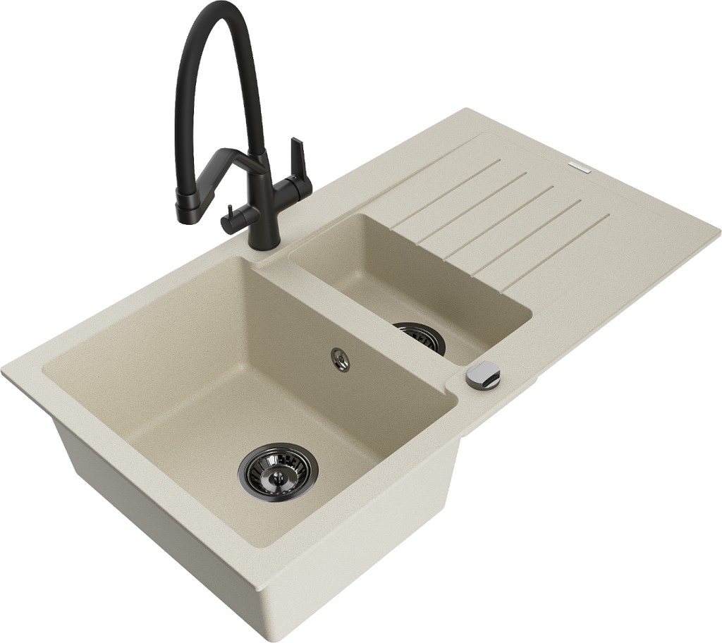 Technické dáta: drez: Rozmer: 900x505x200mm Hĺbka komory: 180 mm (väčšia), 115 mm (menšia) Rozmery komory: 435x335 mm (väčšie), 345x150 mm (menšie) Priemer odtoku: ø90 mm Typ: 1,5-miska s krátkym odkvapkávačom Typ: Zapustené do pracovnej dosky Farba béžová Povrchová úprava sifónu: čierna Materiál: žula (80% žulové kamenivo, 20% živice) Prepadový otvor: Áno Otvory: (batérie, automatické) 2 Inštalácia: Univerzálna, je možné inštalovať s odkvapkávačom na ľavú alebo pravú stranu Vysoká odolnosť proti poškriabaniu a zmene farby Odolnosť proti tepelným šokom Ľahko čistiteľný povrch Dva dodatočné vyfrézované otvory na samodierovanie ø35 kuchynská batéria: Materiál: mosadz Povrchová úprava: čierna Hlavy: Keramické Prevzdušňovač: Áno Typ hubica: Flexibilný s mosadzným držiakom Rozsah výtoku: 260 mm Výška: 405 mm Typ: Dve rukoväte Dvojhlavá batéria s prídavným kanálom pre filtrovanú pitnú vodu (GT) Ean: 5905315049766