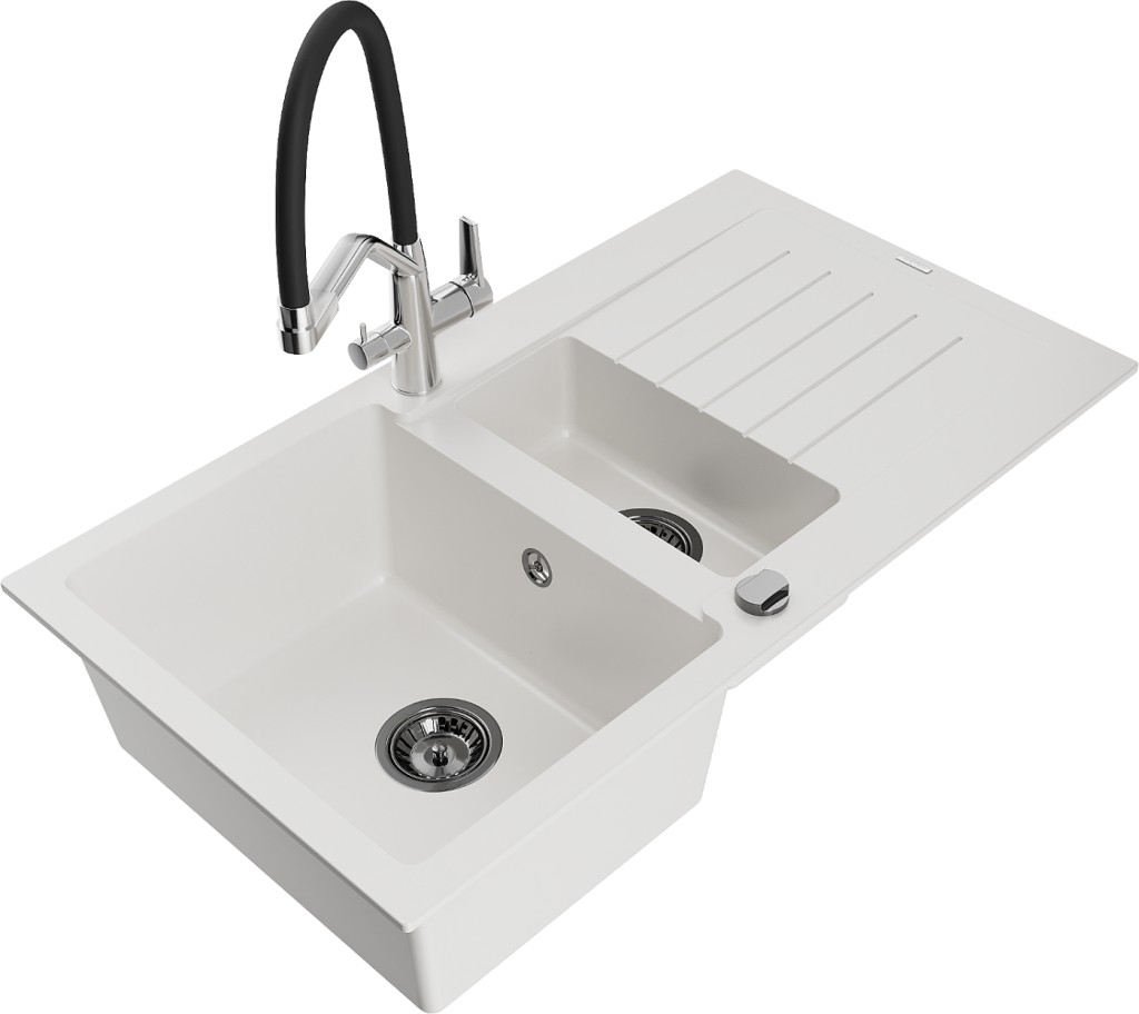 Technické dáta: drez: Rozmer: 900x505x200mm Hĺbka komory: 180 mm (väčšia), 115 mm (menšia) Rozmery komory: 435x335 mm (väčšie), 345x150 mm (menšie) Priemer odtoku: ø90 mm Typ: 1,5-miska s krátkym odkvapkávačom Typ: Zapustené do pracovnej dosky biela farba Povrchová úprava sifónu: čierna Materiál: žula (80% žulové kamenivo, 20% živice) Prepadový otvor: Áno Otvory: (batérie, automatické) 2 Inštalácia: Univerzálna, je možné inštalovať s odkvapkávačom na ľavú alebo pravú stranu Vysoká odolnosť proti poškriabaniu a zmene farby Odolnosť proti tepelným šokom Ľahko čistiteľný povrch Dva dodatočné vyfrézované otvory na samodierovanie ø35 kuchynská batéria: Materiál: mosadz Povrchová úprava: chróm / čierna Hlavy: Keramické Prevzdušňovač: Áno Typ hubica: Flexibilný s mosadzným držiakom Rozsah výtoku: 260 mm Výška: 405 mm Typ: Dve rukoväte Dvojhlavá batéria s prídavným kanálom pre filtrovanú pitnú vodu(GT) Ean: 5905315049674