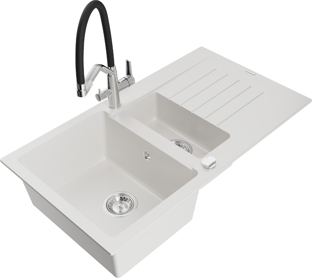 Technické dáta: drez: Rozmer: 900x505x200mm Hĺbka komory: 180 mm (väčšia), 115 mm (menšia) Rozmery komory: 435x335 mm (väčšie), 345x150 mm (menšie) Priemer odtoku: ø90 mm Typ: 1,5-miska s krátkym odkvapkávačom Typ: Zapustené do pracovnej dosky biela farba Povrchová úprava sifónu: Chrome Materiál: žula (80% žulové kamenivo, 20% živice) Prepadový otvor: Áno Otvory: (batérie, automatické) 2 Inštalácia: Univerzálna, je možné inštalovať s odkvapkávačom na ľavú alebo pravú stranu Vysoká odolnosť proti poškriabaniu a zmene farby Odolnosť proti tepelným šokom Ľahko čistiteľný povrch Dva dodatočné vyfrézované otvory na samodierovanie ø35 kuchynská batéria: Materiál: mosadz Povrchová úprava: chróm / čierna Hlavy: Keramické Prevzdušňovač: Áno Typ hubica: Flexibilný s mosadzným držiakom Rozsah výtoku: 260 mm Výška: 405 mm Typ: Dve rukoväte Dvojhlavá batéria s prídavným kanálom pre filtrovanú pitnú vodu(GT) Ean: 5905315049667