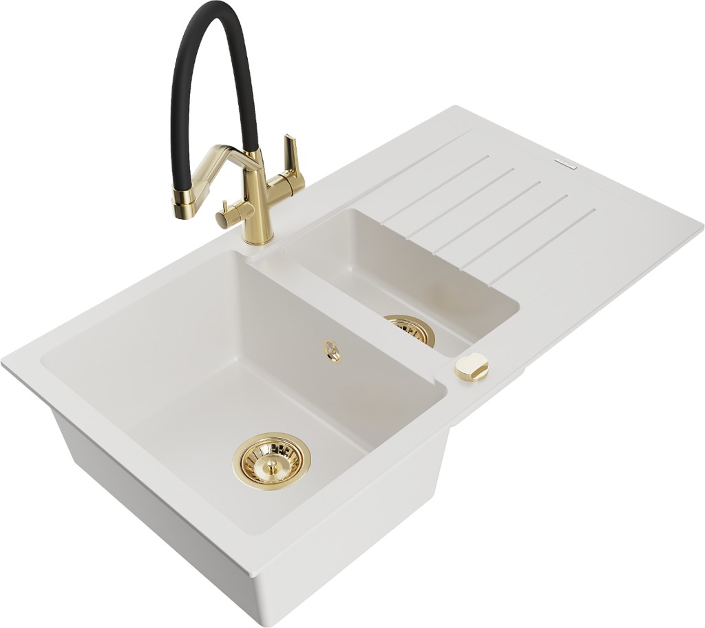 Technické dáta: drez: Rozmer: 900x505x200mm Hĺbka komory: 180 mm (väčšia), 115 mm (menšia) Rozmery komory: 435x335 mm (väčšie), 345x150 mm (menšie) Priemer odtoku: ø90 mm Typ: 1,5-miska s krátkym odkvapkávačom Typ: Zapustené do pracovnej dosky biela farba Povrchová úprava sifónu: zlatá Materiál: žula (80% žulové kamenivo, 20% živice) Prepadový otvor: Áno Otvory: (batérie, automatické) 2 Inštalácia: Univerzálna, je možné inštalovať s odkvapkávačom na ľavú alebo pravú stranu Vysoká odolnosť proti poškriabaniu a zmene farby Odolnosť proti tepelným šokom Ľahko čistiteľný povrch Dva dodatočné vyfrézované otvory na samodierovanie ø35 kuchynská batéria: Materiál: mosadz Povrchová úprava: zlatá/čierna Hlavy: Keramické Prevzdušňovač: Áno Typ hubica: Flexibilný s mosadzným držiakom Rozsah výtoku: 260 mm Výška: 405 mm Typ: Dve rukoväte Dvojhlavá batéria s prídavným kanálom pre filtrovanú pitnú vodu(GT) Ean: 5905315049681