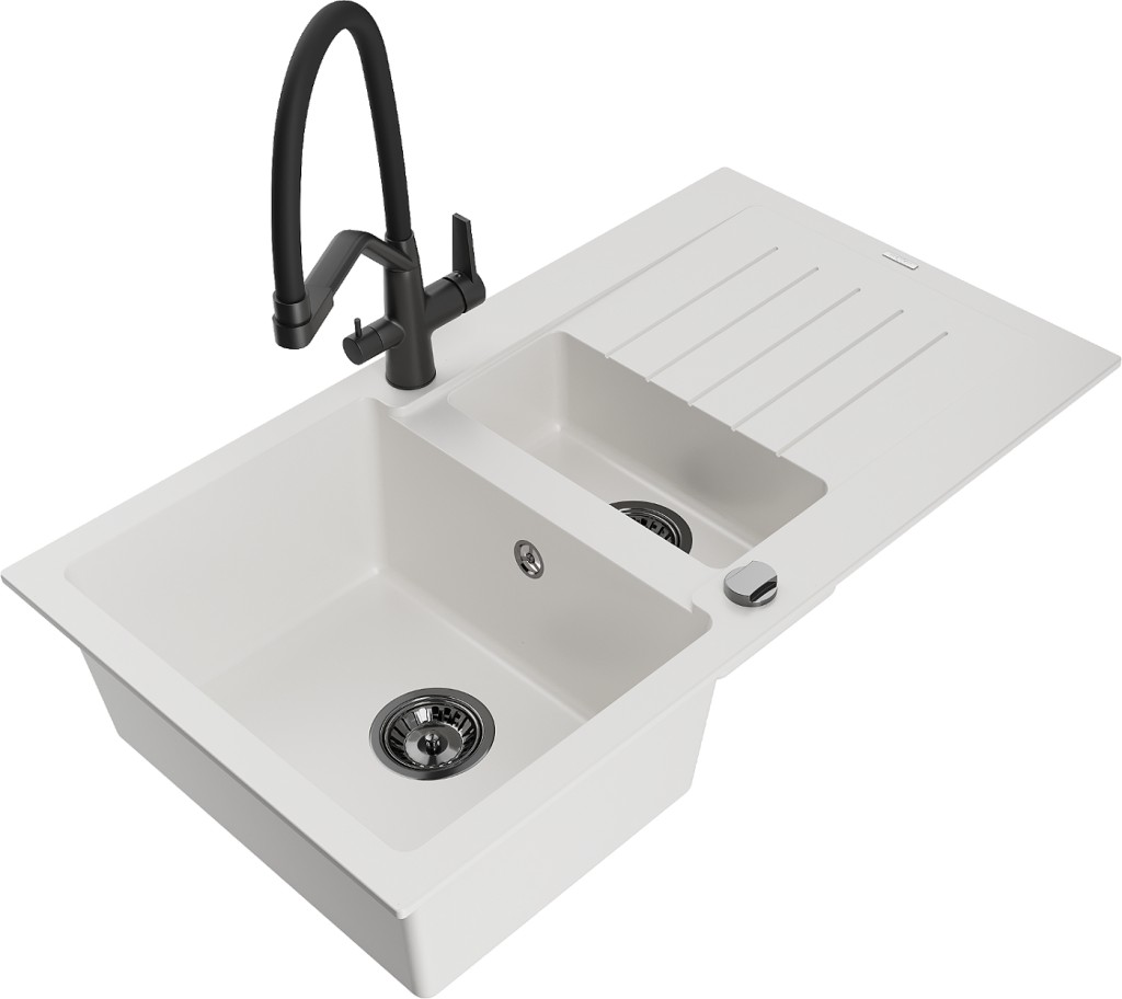 Technické dáta: drez: Rozmer: 900x505x200mm Hĺbka komory: 180 mm (väčšia), 115 mm (menšia) Rozmery komory: 435x335 mm (väčšie), 345x150 mm (menšie) Priemer odtoku: ø90 mm Typ: 1,5-miska s krátkym odkvapkávačom Typ: Zapustené do pracovnej dosky biela farba Povrchová úprava sifónu: čierna Materiál: žula (80% žulové kamenivo, 20% živice) Prepadový otvor: Áno Otvory: (batérie, automatické) 2 Inštalácia: Univerzálna, je možné inštalovať s odkvapkávačom na ľavú alebo pravú stranu Vysoká odolnosť proti poškriabaniu a zmene farby Odolnosť proti tepelným šokom Ľahko čistiteľný povrch Dva dodatočné vyfrézované otvory na samodierovanie ø35 kuchynská batéria: Materiál: mosadz Povrchová úprava: čierna Hlavy: Keramické Prevzdušňovač: Áno Typ hubica: Flexibilný s mosadzným držiakom Rozsah výtoku: 260 mm Výška: 405 mm Typ: Dve rukoväte Dvojhlavá batéria s prídavným kanálom pre filtrovanú pitnú vodu(GT) Ean: 5905315049704