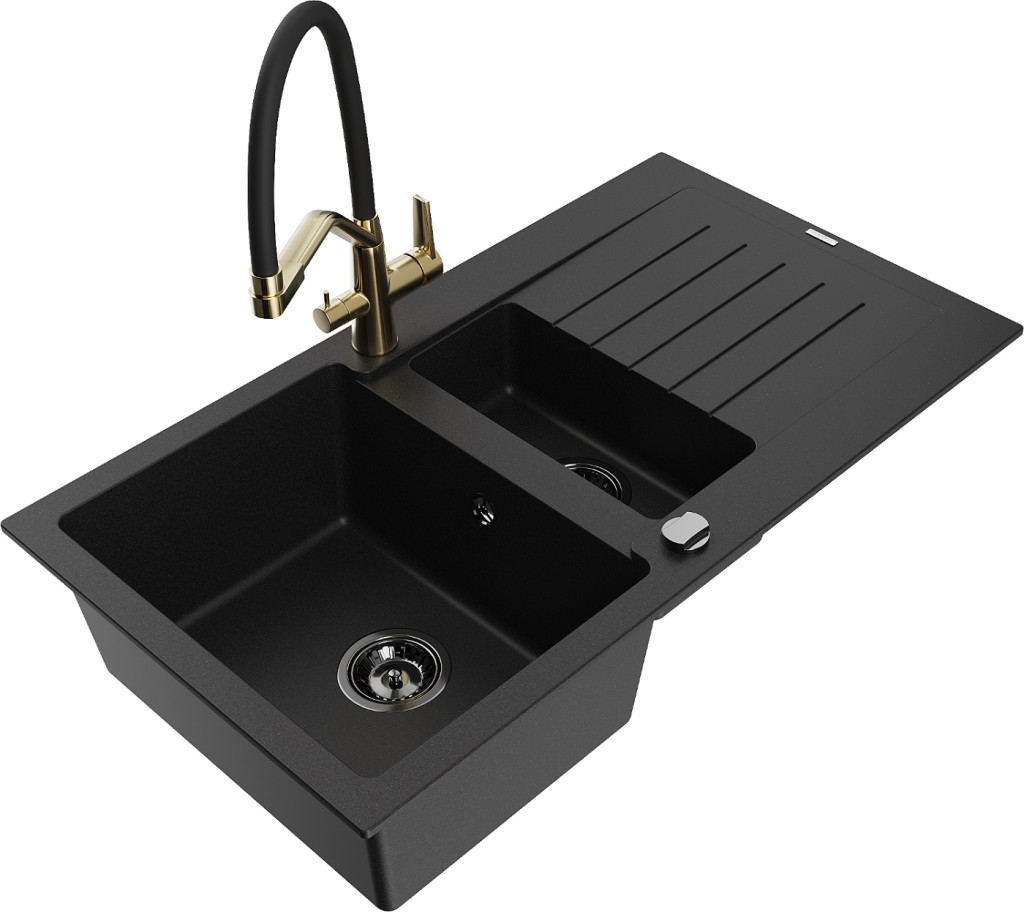 Technické dáta: drez: Rozmer: 900x505x200mm Hĺbka komory: 180 mm (väčšia), 115 mm (menšia) Rozmery komory: 435x335 mm (väčšie), 345x150 mm (menšie) Priemer odtoku: ø90 mm Typ: 1,5-miska s krátkym odkvapkávačom Typ: Zapustené do pracovnej dosky Čierna farba Povrchová úprava sifónu: čierna Materiál: žula (80% žulové kamenivo, 20% živice) Prepadový otvor: Áno Otvory: (batérie, automatické) 2 Inštalácia: Univerzálna, je možné inštalovať s odkvapkávačom na ľavú alebo pravú stranu Vysoká odolnosť proti poškriabaniu a zmene farby Odolnosť proti tepelným šokom Ľahko čistiteľný povrch Dva dodatočné vyfrézované otvory na samodierovanie ø35 kuchynská batéria: Materiál: mosadz Povrchová úprava: zlatá/čierna Hlavy: Keramické Prevzdušňovač: Áno Typ hubica: Flexibilný s mosadzným držiakom Rozsah výtoku: 260 mm Výška: 405 mm Typ: Dve rukoväte Dvojhlavá batéria s prídavným filtrom na pitnú vodu(GT) Ean: 5905315042811