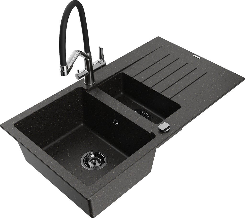 Technické dáta: drez: Rozmer: 900x505x200mm Hĺbka komory: 180 mm (väčšia), 115 mm (menšia) Rozmery komory: 435x335 mm (väčšie), 345x150 mm (menšie) Priemer odtoku: ø90 mm Typ: 1,5-miska s krátkym odkvapkávačom Typ: Zapustené do pracovnej dosky Farba: čierna / zlatá metalíza Povrchová úprava sifónu: čierna Materiál: žula (80% žulové kamenivo, 20% živice) Prepadový otvor: Áno Otvory: (batérie, automatické) 2 Inštalácia: Univerzálna, je možné inštalovať s odkvapkávačom na ľavú alebo pravú stranu Vysoká odolnosť proti poškriabaniu a zmene farby Odolnosť proti tepelným šokom Ľahko čistiteľný povrch Dva dodatočné vyfrézované otvory na samodierovanie ø35 kuchynská batéria: Materiál: mosadz Povrchová úprava: chróm / čierna Hlavy: Keramické Prevzdušňovač: Áno Typ hubica: Flexibilný s mosadzným držiakom Rozsah výtoku: 260 mm Výška: 405 mm Typ: Dve rukoväte Dvojhlavá batéria s prídavným filtrom na pitnú vodu(GT) Ean: 5905315049919