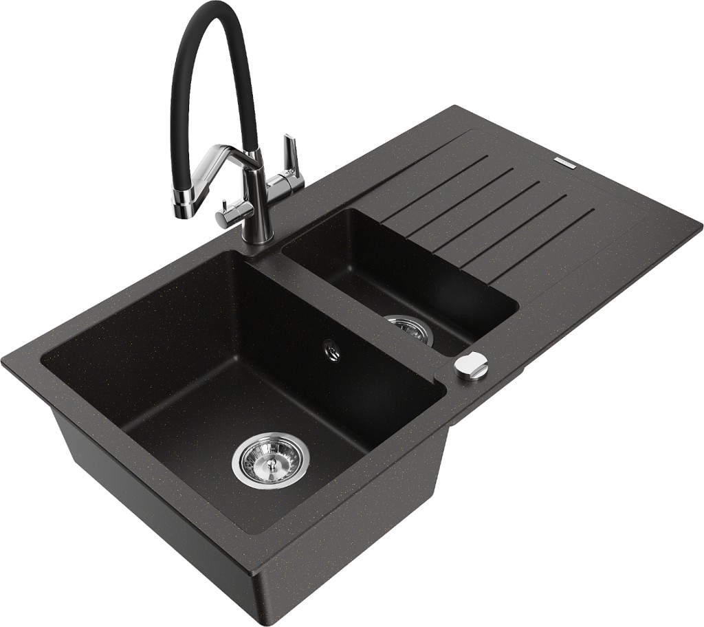 Technické dáta: drez: Rozmer: 900x505x200mm Hĺbka komory: 180 mm (väčšia), 115 mm (menšia) Rozmery komory: 435x335 mm (väčšie), 345x150 mm (menšie) Priemer odtoku: ø90 mm Typ: 1,5-miska s krátkym odkvapkávačom Typ: Zapustené do pracovnej dosky Farba: čierna / zlatá metalíza Povrchová úprava sifónu: Chrome Materiál: žula (80% žulové kamenivo, 20% živice) Prepadový otvor: Áno Otvory: (batérie, automatické) 2 Inštalácia: Univerzálna, je možné inštalovať s odkvapkávačom na ľavú alebo pravú stranu Vysoká odolnosť proti poškriabaniu a zmene farby Odolnosť proti tepelným šokom Ľahko čistiteľný povrch Dva dodatočné vyfrézované otvory na samodierovanie ø35 kuchynská batéria: Materiál: mosadz Povrchová úprava: chróm / čierna Hlavy: Keramické Prevzdušňovač: Áno Typ hubica: Flexibilný s mosadzným držiakom Rozsah výtoku: 260 mm Výška: 405 mm Typ: Dve rukoväte Dvojhlavá batéria s prídavným filtrom na pitnú vodu(GT) Ean: 5905315049902