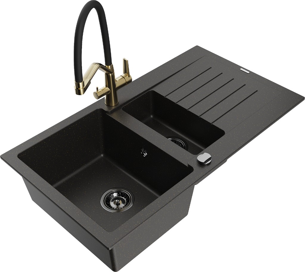 Technické dáta: drez: Rozmer: 900x505x200mm Hĺbka komory: 180 mm (väčšia), 115 mm (menšia) Rozmery komory: 435x335 mm (väčšie), 345x150 mm (menšie) Priemer odtoku: ø90 mm Typ: 1,5-miska s krátkym odkvapkávačom Typ: Zapustené do pracovnej dosky Farba: čierna / zlatá metalíza Povrchová úprava sifónu: čierna Materiál: žula (80% žulové kamenivo, 20% živice) Prepadový otvor: Áno Otvory: (batérie, automatické) 2 Inštalácia: Univerzálna, je možné inštalovať s odkvapkávačom na ľavú alebo pravú stranu Vysoká odolnosť proti poškriabaniu a zmene farby Odolnosť proti tepelným šokom Ľahko čistiteľný povrch Dva dodatočné vyfrézované otvory na samodierovanie ø35 kuchynská batéria: Materiál: mosadz Povrchová úprava: zlatá/čierna Hlavy: Keramické Prevzdušňovač: Áno Typ hubica: Flexibilný s mosadzným držiakom Rozsah výtoku: 260 mm Výška: 405 mm Typ: Dve rukoväte Dvojhlavá batéria s prídavným filtrom na pitnú vodu(GT) Ean: 5905315049933