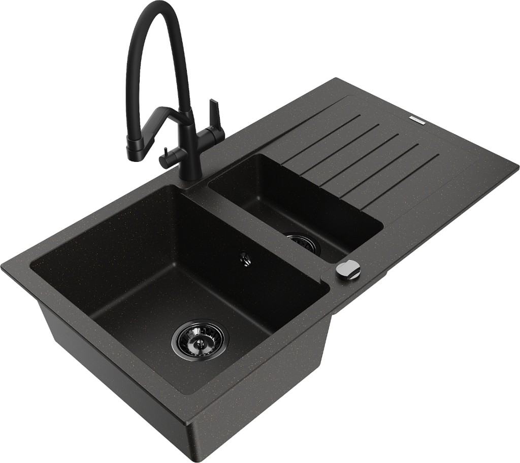 Technické dáta: drez: Rozmer: 900x505x200mm Hĺbka komory: 180 mm (väčšia), 115 mm (menšia) Rozmery komory: 435x335 mm (väčšie), 345x150 mm (menšie) Priemer odtoku: ø90 mm Typ: 1,5-miska s krátkym odkvapkávačom Typ: Zapustené do pracovnej dosky Farba: čierna / zlatá metalíza Povrchová úprava sifónu: čierna Materiál: žula (80% žulové kamenivo, 20% živice) Prepadový otvor: Áno Otvory: (batérie, automatické) 2 Inštalácia: Univerzálna, je možné inštalovať s odkvapkávačom na ľavú alebo pravú stranu Vysoká odolnosť proti poškriabaniu a zmene farby Odolnosť proti tepelným šokom Ľahko čistiteľný povrch Dva dodatočné vyfrézované otvory na samodierovanie ø35 kuchynská batéria: Materiál: mosadz Povrchová úprava: čierna Hlavy: Keramické Prevzdušňovač: Áno Typ hubica: Flexibilný s mosadzným držiakom Rozsah výtoku: 260 mm Výška: 405 mm Typ: Dve rukoväte Dvojhlavá batéria s prídavným filtrom na pitnú vodu(GT) Ean: 5905315049940
