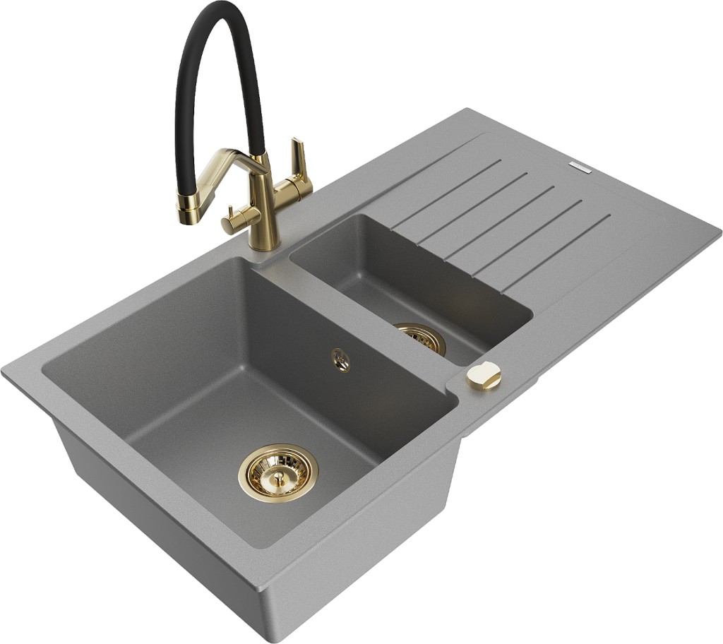 Technické dáta: drez: Rozmer: 900x505x200mm Hĺbka komory: 180 mm (väčšia), 115 mm (menšia) Rozmery komory: 435x335 mm (väčšie), 345x150 mm (menšie) Priemer odtoku: ø90 mm Typ: 1,5-miska s krátkym odkvapkávačom Typ: Zapustené do pracovnej dosky Šedá farba Povrchová úprava sifónu: zlatá Materiál: žula (80% žulové kamenivo, 20% živice) Prepadový otvor: Áno Otvory: (batérie, automatické) 2 Inštalácia: Univerzálna, je možné inštalovať s odkvapkávačom na ľavú alebo pravú stranu Vysoká odolnosť proti poškriabaniu a zmene farby Odolnosť proti tepelným šokom Ľahko čistiteľný povrch Dva dodatočné vyfrézované otvory na samodierovanie ø35 kuchynská batéria: Materiál: mosadz Povrchová úprava: zlatá/čierna Hlavy: Keramické Prevzdušňovač: Áno Typ hubica: Flexibilný s mosadzným držiakom Rozsah výtoku: 260 mm Výška: 405 mm Typ: Dve rukoväte Dvojhlavá batéria s prídavným kanálom pre filtrovanú pitnú vodu(GT) Ean: 5905315049803
