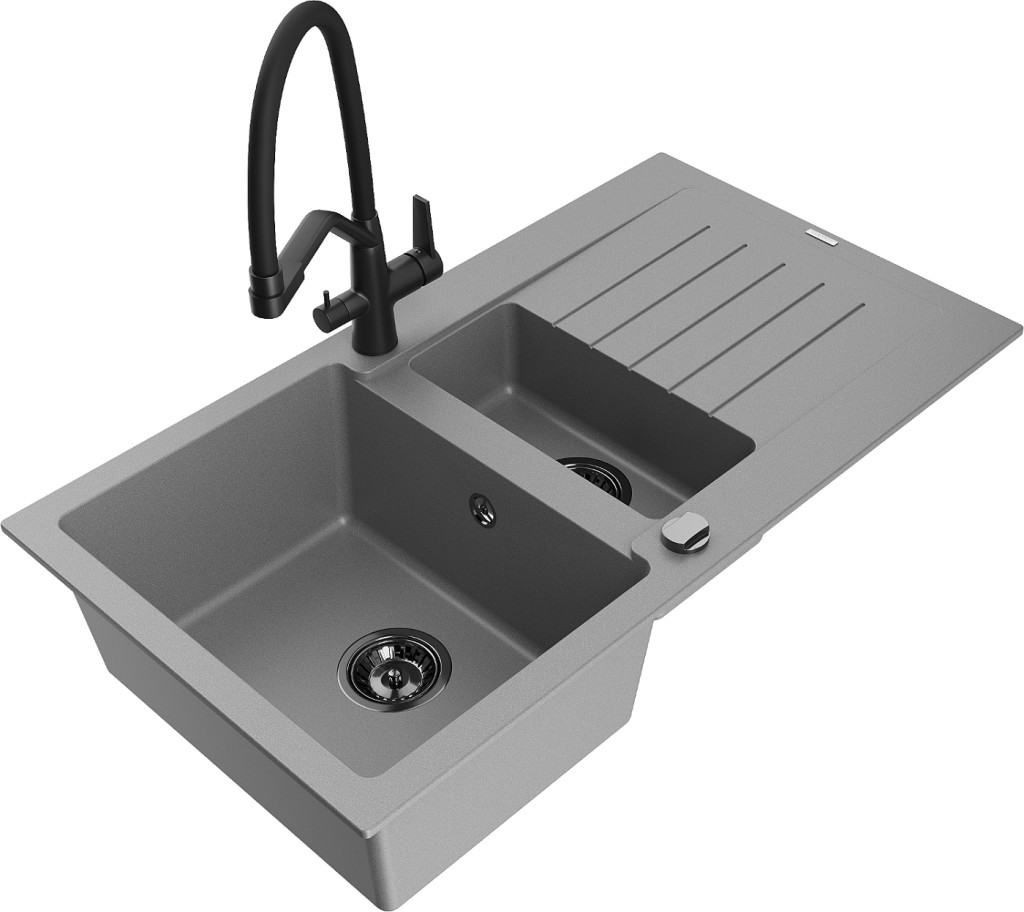 Technické dáta: drez: Rozmer: 900x505x200mm Hĺbka komory: 180 mm (väčšia), 115 mm (menšia) Rozmery komory: 435x335 mm (väčšie), 345x150 mm (menšie) Priemer odtoku: ø90 mm Typ: 1,5-miska s krátkym odkvapkávačom Typ: Zapustené do pracovnej dosky Šedá farba Povrchová úprava sifónu: čierna Materiál: žula (80% žulové kamenivo, 20% živice) Prepadový otvor: Áno Otvory: (batérie, automatické) 2 Inštalácia: Univerzálna, je možné inštalovať s odkvapkávačom na ľavú alebo pravú stranu Vysoká odolnosť proti poškriabaniu a zmene farby Odolnosť proti tepelným šokom Ľahko čistiteľný povrch Dva dodatočné vyfrézované otvory na samodierovanie ø35 kuchynská batéria: Materiál: mosadz Povrchová úprava: čierna Hlavy: Keramické Prevzdušňovač: Áno Typ hubica: Flexibilný s mosadzným držiakom Rozsah výtoku: 260 mm Výška: 405 mm Typ: Dve rukoväte Dvojhlavá batéria s prídavným kanálom pre filtrovanú pitnú vodu(GT) Ean: 5905315049827