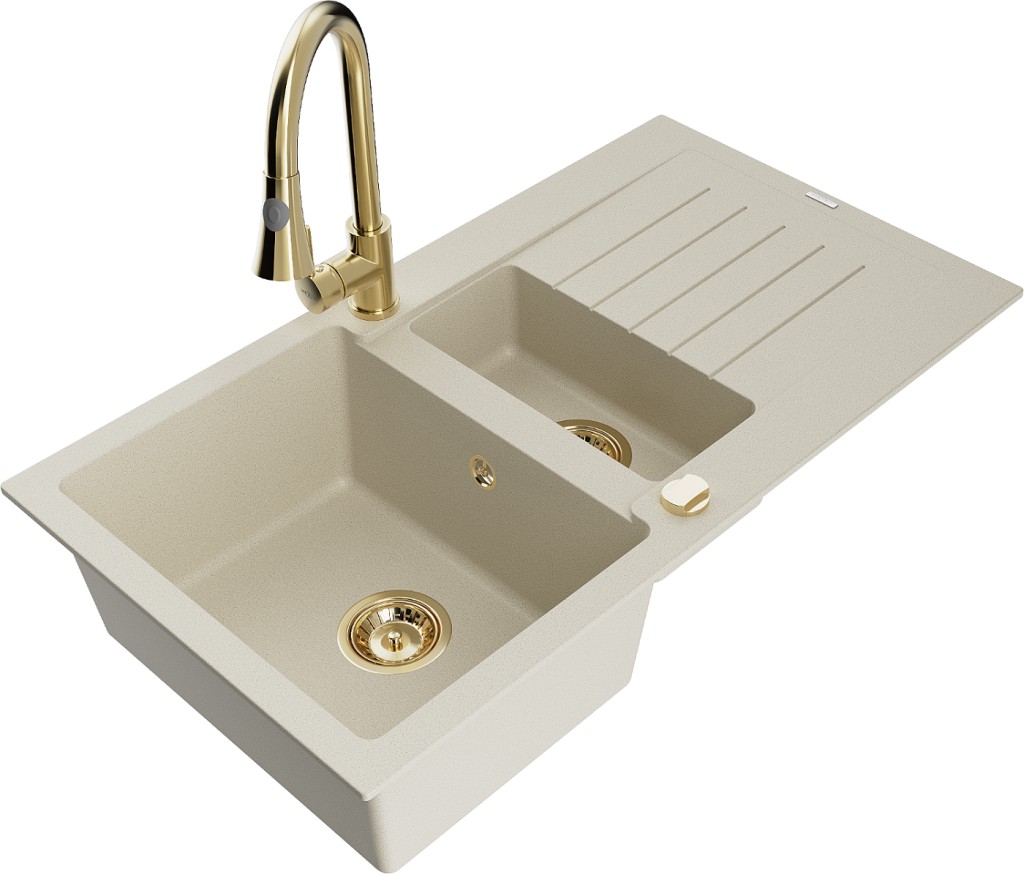 Technické dáta: drez: Rozmer: 900x505x200mm Hĺbka komory: 180 mm (väčšia), 115 mm (menšia) Rozmery komory: 435x335 mm (väčšie), 345x150 mm (menšie) Priemer odtoku: ø90 mm Typ: 1,5-miska s krátkym odkvapkávačom Typ: Zapustené do pracovnej dosky Farba béžová Povrchová úprava sifónu: zlatá Materiál: žula (80% žulové kamenivo, 20% živice) Prepadový otvor: Áno Otvory: (batérie, automatické) 2 Inštalácia: Univerzálna, je možné inštalovať s odkvapkávačom na ľavú alebo pravú stranu Vysoká odolnosť proti poškriabaniu a zmene farby Odolnosť proti tepelným šokom Ľahko čistiteľný povrch Dva dodatočné vyfrézované otvory na samodierovanie ø35 kuchynská batéria: Materiál: mosadz Farba: Zlatá Hlava: Keramická Prevzdušňovač: Áno Typ: Jedna páka Výška batérie: 380 mm Rozsah výtoku: 252 mm Typ výtoku: Výsuvný (GT) Ean: 5905315027504