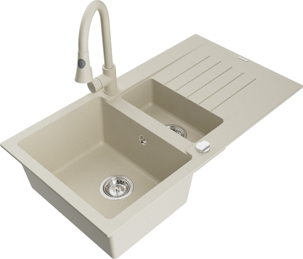 Technické dáta: drez: Rozmer: 900x505x200mm Hĺbka komory: 180 mm (väčšia), 115 mm (menšia) Rozmery komory: 435x335 mm (väčšie), 345x150 mm (menšie) Priemer odtoku: ø90 mm Typ: 1,5-miska s krátkym odkvapkávačom Typ: Zapustené do pracovnej dosky Farba béžová Povrchová úprava sifónu: Chrome Materiál: žula (80% žulové kamenivo, 20% živice) Prepadový otvor: Áno Otvory: (batérie, automatické) 2 Inštalácia: Univerzálna, je možné inštalovať s odkvapkávačom na ľavú alebo pravú stranu Vysoká odolnosť proti poškriabaniu a zmene farby Odolnosť proti tepelným šokom Ľahko čistiteľný povrch Dva dodatočné vyfrézované otvory na samodierovanie ø35 kuchynská batéria: Materiál: mosadz Farba béžová Hlava: Keramická Prevzdušňovač: Áno Typ: Jedna páka Výška batérie: 380 mm Rozsah výtoku: 252 mm Typ výtoku: Výsuvný(GT) Ean: 5905315027498
