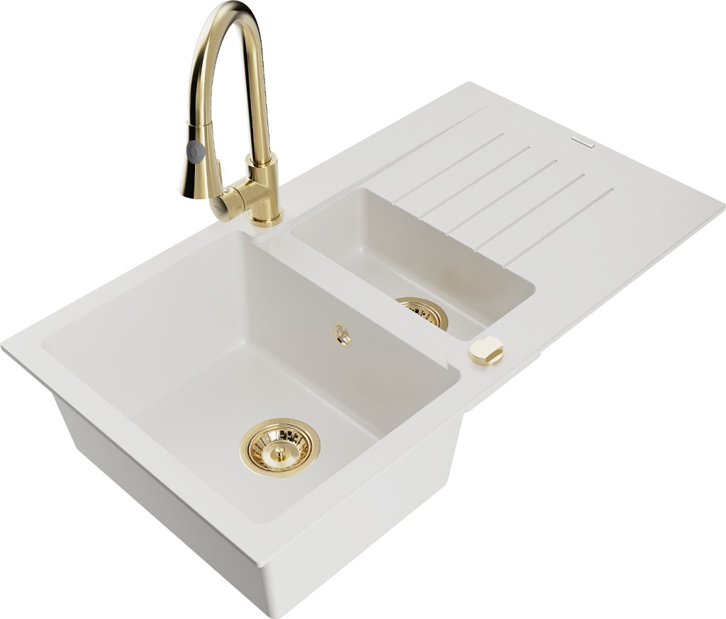 Technické dáta: drez: Rozmer: 900x505x200mm Hĺbka komory: 180 mm (väčšia), 115 mm (menšia) Rozmery komory: 435x335 mm (väčšie), 345x150 mm (menšie) Priemer odtoku: ø90 mm Typ: 1,5-miska s krátkym odkvapkávačom Typ: Zapustené do pracovnej dosky biela farba Povrchová úprava sifónu: zlatá Materiál: žula (80% žulové kamenivo, 20% živice) Prepadový otvor: Áno Otvory: (batérie, automatické) 2 Inštalácia: Univerzálna, je možné inštalovať s odkvapkávačom na ľavú alebo pravú stranu Vysoká odolnosť proti poškriabaniu a zmene farby Odolnosť proti tepelným šokom Ľahko čistiteľný povrch Dva dodatočné vyfrézované otvory na samodierovanie ø35 kuchynská batéria: Materiál: mosadz Farba: Zlatá Hlava: Keramická Prevzdušňovač: Áno Typ: Jedna páka Výška batérie: 380 mm Rozsah výtoku: 252 mm Typ výtoku: Výsuvný(GT) Ean: 5905315027467