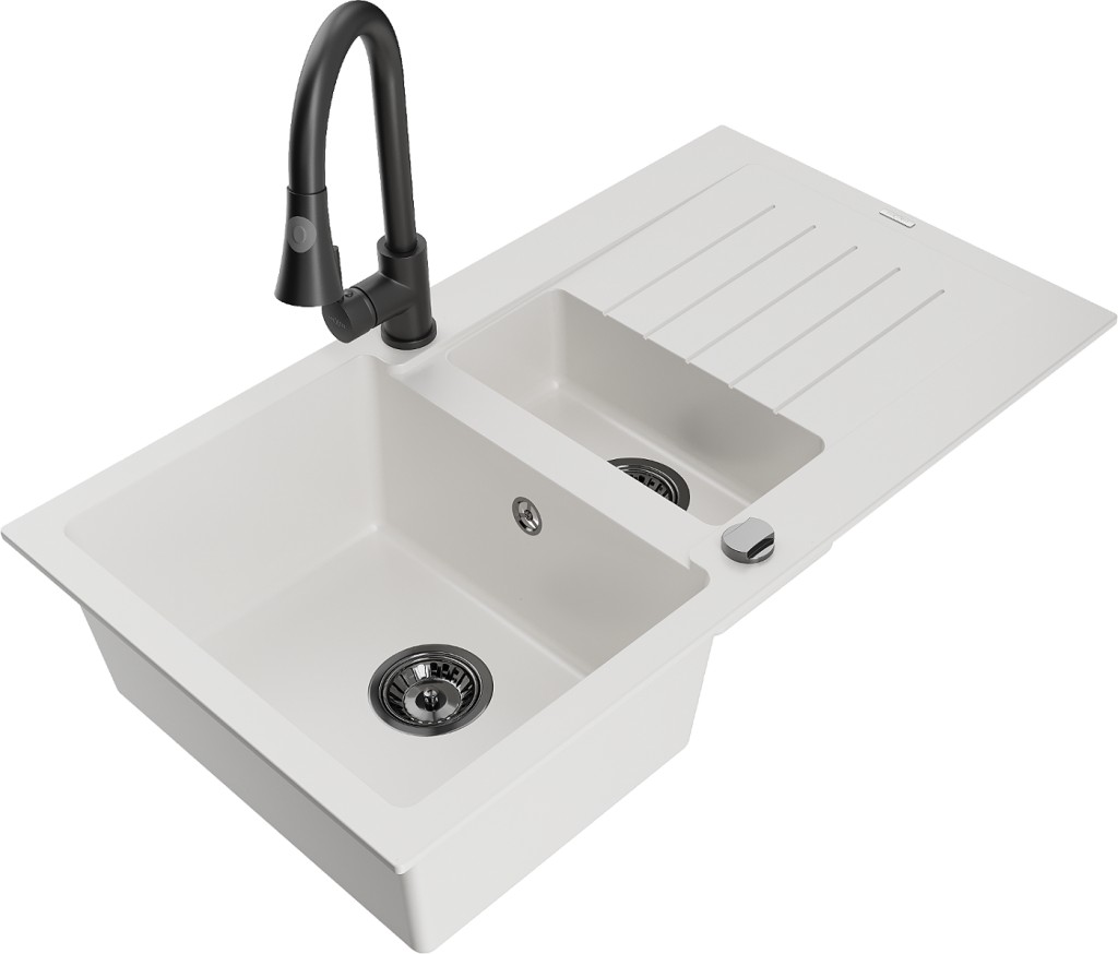 Technické dáta: drez: Rozmer: 900x505x200mm Hĺbka komory: 180 mm (väčšia), 115 mm (menšia) Rozmery komory: 435x335 mm (väčšie), 345x150 mm (menšie) Priemer odtoku: ø90 mm Typ: 1,5-miska s krátkym odkvapkávačom Typ: Zapustené do pracovnej dosky biela farba Povrchová úprava sifónu: čierna Materiál: žula (80% žulové kamenivo, 20% živice) Prepadový otvor: Áno Otvory: (batérie, automatické) 2 Inštalácia: Univerzálna, je možné inštalovať s odkvapkávačom na ľavú alebo pravú stranu Vysoká odolnosť proti poškriabaniu a zmene farby Odolnosť proti tepelným šokom Ľahko čistiteľný povrch Dva dodatočné vyfrézované otvory na samodierovanie ø35 kuchynská batéria: Materiál: mosadz Čierna farba Hlava: Keramická Prevzdušňovač: Áno Typ: Jedna páka Výška batérie: 380 mm Rozsah výtoku: 252 mm Typ výtoku: Výsuvný(GT) Ean: 5905315027474