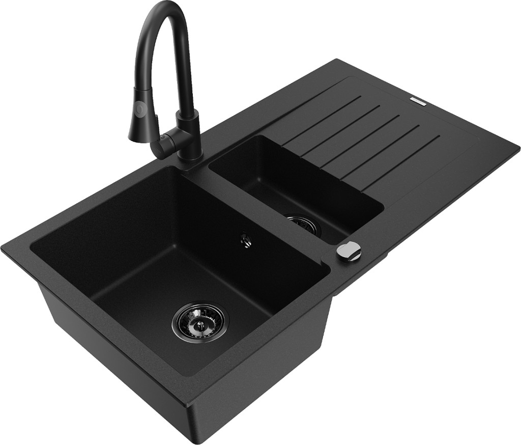 Technické dáta: drez: Rozmer: 900x505x200mm Hĺbka komory: 180 mm (väčšia), 115 mm (menšia) Rozmery komory: 435x335 mm (väčšie), 345x150 mm (menšie) Priemer odtoku: ø90 mm Typ: 1,5-miska s krátkym odkvapkávačom Typ: Zapustené do pracovnej dosky Čierna farba Povrchová úprava sifónu: čierna Materiál: žula (80% žulové kamenivo, 20% živice) Prepadový otvor: Áno Otvory: (batérie, automatické) 2 Inštalácia: Univerzálna, je možné inštalovať s odkvapkávačom na ľavú alebo pravú stranu Vysoká odolnosť proti poškriabaniu a zmene farby Odolnosť proti tepelným šokom Ľahko čistiteľný povrch Dva dodatočné vyfrézované otvory na samodierovanie ø35 kuchynská batéria: Materiál: mosadz Čierna farba Hlava: Keramická Prevzdušňovač: Áno Typ: Jedna páka Výška batérie: 380 mm Rozsah výtoku: 252 mm Typ výtoku: Výsuvný(GT) Ean: 5905315027757