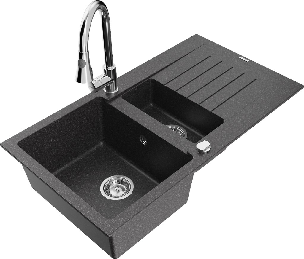 Technické dáta: drez: Rozmer: 900x505x200mm Hĺbka komory: 180 mm (väčšia), 115 mm (menšia) Rozmery komory: 435x335 mm (väčšie), 345x150 mm (menšie) Priemer odtoku: ø90 mm Typ: 1,5-miska s krátkym odkvapkávačom Typ: Zapustené do pracovnej dosky Farba: Škvrnitá čierna Povrchová úprava sifónu: Chrome Materiál: žula (80% žulové kamenivo, 20% živice) Prepadový otvor: Áno Otvory: (batérie, automatické) 2 Inštalácia: Univerzálna, je možné inštalovať s odkvapkávačom na ľavú alebo pravú stranu Vysoká odolnosť proti poškriabaniu a zmene farby Odolnosť proti tepelným šokom Ľahko čistiteľný povrch Dva dodatočné vyfrézované otvory na samodierovanie ø35 kuchynská batéria: Materiál: mosadz Farba: Chrome Hlava: Keramická Prevzdušňovač: Áno Typ: Jedna páka Výška batérie: 380 mm Rozsah výtoku: 252 mm Typ výtoku: Výsuvný(GT) Ean: 5905315027665