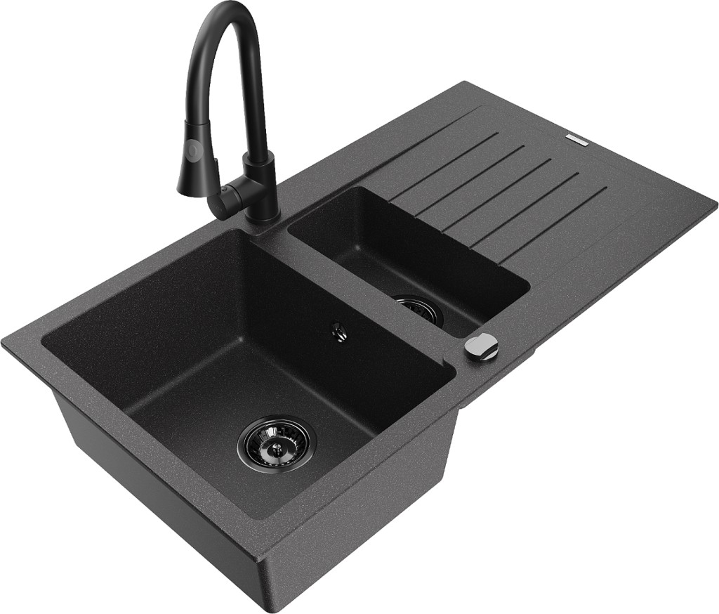 Technické dáta: drez: Rozmer: 900x505x200mm Hĺbka komory: 180 mm (väčšia), 115 mm (menšia) Rozmery komory: 435x335 mm (väčšie), 345x150 mm (menšie) Priemer odtoku: ø90 mm Typ: 1,5-miska s krátkym odkvapkávačom Typ: Zapustené do pracovnej dosky Farba: Škvrnitá čierna Povrchová úprava sifónu: čierna Materiál: žula (80% žulové kamenivo, 20% živice) Prepadový otvor: Áno Otvory: (batérie, automatické) 2 Inštalácia: Univerzálna, je možné inštalovať s odkvapkávačom na ľavú alebo pravú stranu Vysoká odolnosť proti poškriabaniu a zmene farby Odolnosť proti tepelným šokom Ľahko čistiteľný povrch Dva dodatočné vyfrézované otvory na samodierovanie ø35 kuchynská batéria: Materiál: mosadz Čierna farba Hlava: Keramická Prevzdušňovač: Áno Typ: Jedna páka Výška batérie: 380 mm Rozsah výtoku: 252 mm Typ výtoku: Výsuvný(GT) Ean: 5905315027696