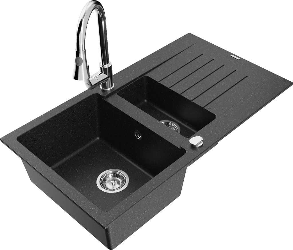 Technické dáta: drez: Rozmer: 900x505x200mm Hĺbka komory: 180 mm (väčšia), 115 mm (menšia) Rozmery komory: 435x335 mm (väčšie), 345x150 mm (menšie) Priemer odtoku: ø90 mm Typ: 1,5-miska s krátkym odkvapkávačom Typ: Zapustené do pracovnej dosky Farba: čierna/strieborná metalíza Povrchová úprava sifónu: Chrome Materiál: žula (80% žulové kamenivo, 20% živice) Prepadový otvor: Áno Otvory: (batérie, automatické) 2 Inštalácia: Univerzálna, je možné inštalovať s odkvapkávačom na ľavú alebo pravú stranu Vysoká odolnosť proti poškriabaniu a zmene farby Odolnosť proti tepelným šokom Ľahko čistiteľný povrch Dva dodatočné vyfrézované otvory na samodierovanie ø35 kuchynská batéria: Materiál: mosadz Farba: Chrome Hlava: Keramická Prevzdušňovač: Áno Typ: Jedna páka Výška batérie: 380 mm Rozsah výtoku: 252 mm Typ výtoku: Výsuvný(GT) Ean: 5905315027573
