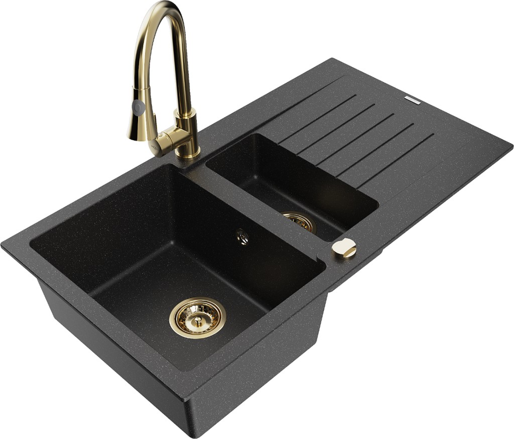 Technické dáta: drez: Rozmer: 900x505x200mm Hĺbka komory: 180 mm (väčšia), 115 mm (menšia) Rozmery komory: 435x335 mm (väčšie), 345x150 mm (menšie) Priemer odtoku: ø90 mm Typ: 1,5-miska s krátkym odkvapkávačom Typ: Zapustené do pracovnej dosky Farba: čierna/strieborná metalíza Povrchová úprava sifónu: zlatá Materiál: žula (80% žulové kamenivo, 20% živice) Prepadový otvor: Áno Otvory: (batérie, automatické) 2 Inštalácia: Univerzálna, je možné inštalovať s odkvapkávačom na ľavú alebo pravú stranu Vysoká odolnosť proti poškriabaniu a zmene farby Odolnosť proti tepelným šokom Ľahko čistiteľný povrch Dva dodatočné vyfrézované otvory na samodierovanie ø35 kuchynská batéria: Materiál: mosadz Farba: Zlatá Hlava: Keramická Prevzdušňovač: Áno Typ: Jedna páka Výška batérie: 380 mm Rozsah výtoku: 252 mm Typ výtoku: Výsuvný(GT) Ean: 5905315027580