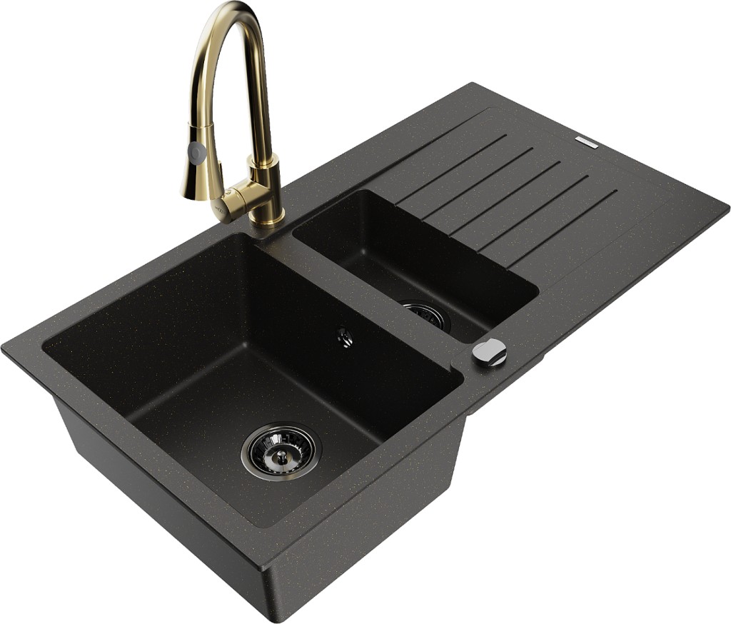 Technické dáta: drez: Rozmer: 900x505x200mm Hĺbka komory: 180 mm (väčšia), 115 mm (menšia) Rozmery komory: 435x335 mm (väčšie), 345x150 mm (menšie) Priemer odtoku: ø90 mm Typ: 1,5-miska s krátkym odkvapkávačom Typ: Zapustené do pracovnej dosky Farba: čierna / zlatá metalíza Povrchová úprava sifónu: čierna Materiál: žula (80% žulové kamenivo, 20% živice) Prepadový otvor: Áno Otvory: (batérie, automatické) 2 Inštalácia: Univerzálna, je možné inštalovať s odkvapkávačom na ľavú alebo pravú stranu Vysoká odolnosť proti poškriabaniu a zmene farby Odolnosť proti tepelným šokom Ľahko čistiteľný povrch Dva dodatočné vyfrézované otvory na samodierovanie ø35 kuchynská batéria: Materiál: mosadz Farba: Zlatá Hlava: Keramická Prevzdušňovač: Áno Typ: Jedna páka Výška batérie: 380 mm Rozsah výtoku: 252 mm Typ výtoku: Výsuvný(GT) Ean: 5905315027634