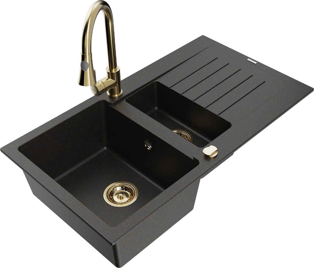 Technické dáta: drez: Rozmer: 900x505x200mm Hĺbka komory: 180 mm (väčšia), 115 mm (menšia) Rozmery komory: 435x335 mm (väčšie), 345x150 mm (menšie) Priemer odtoku: ø90 mm Typ: 1,5-miska s krátkym odkvapkávačom Typ: Zapustené do pracovnej dosky Farba: čierna / zlatá metalíza Povrchová úprava sifónu: zlatá Materiál: žula (80% žulové kamenivo, 20% živice) Prepadový otvor: Áno Otvory: (batérie, automatické) 2 Inštalácia: Univerzálna, je možné inštalovať s odkvapkávačom na ľavú alebo pravú stranu Vysoká odolnosť proti poškriabaniu a zmene farby Odolnosť proti tepelným šokom Ľahko čistiteľný povrch Dva dodatočné vyfrézované otvory na samodierovanie ø35 kuchynská batéria: Materiál: mosadz Farba: Zlatá Hlava: Keramická Prevzdušňovač: Áno Typ: Jedna páka Výška batérie: 380 mm Rozsah výtoku: 252 mm Typ výtoku: Výsuvný(GT) Ean: 5905315027610
