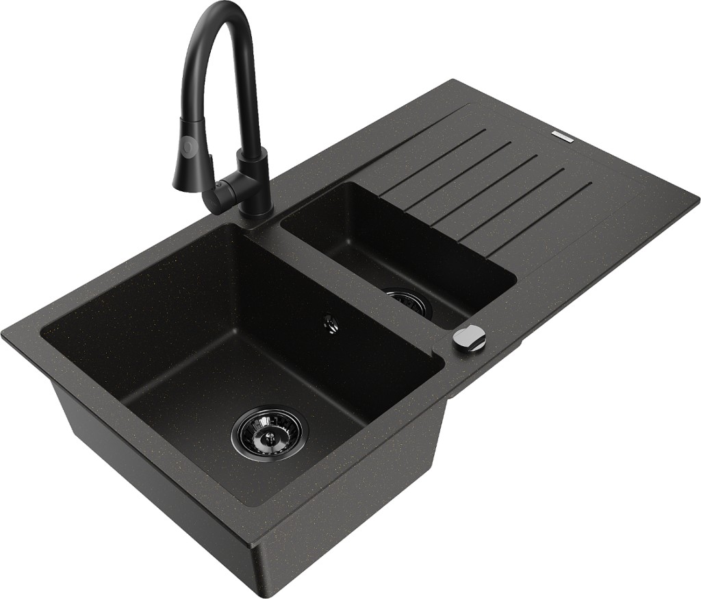 Technické dáta: drez: Rozmer: 900x505x200mm Hĺbka komory: 180 mm (väčšia), 115 mm (menšia) Rozmery komory: 435x335 mm (väčšie), 345x150 mm (menšie) Priemer odtoku: ø90 mm Typ: 1,5-miska s krátkym odkvapkávačom Typ: Zapustené do pracovnej dosky Farba: čierna / zlatá metalíza Povrchová úprava sifónu: čierna Materiál: žula (80% žulové kamenivo, 20% živice) Prepadový otvor: Áno Otvory: (batérie, automatické) 2 Inštalácia: Univerzálna, je možné inštalovať s odkvapkávačom na ľavú alebo pravú stranu Vysoká odolnosť proti poškriabaniu a zmene farby Odolnosť proti tepelným šokom Ľahko čistiteľný povrch Dva dodatočné vyfrézované otvory na samodierovanie ø35 kuchynská batéria: Materiál: mosadz Čierna farba Hlava: Keramická Prevzdušňovač: Áno Typ: Jedna páka Výška batérie: 380 mm Rozsah výtoku: 252 mm Typ výtoku: Výsuvný(GT) Ean: 5905315027658