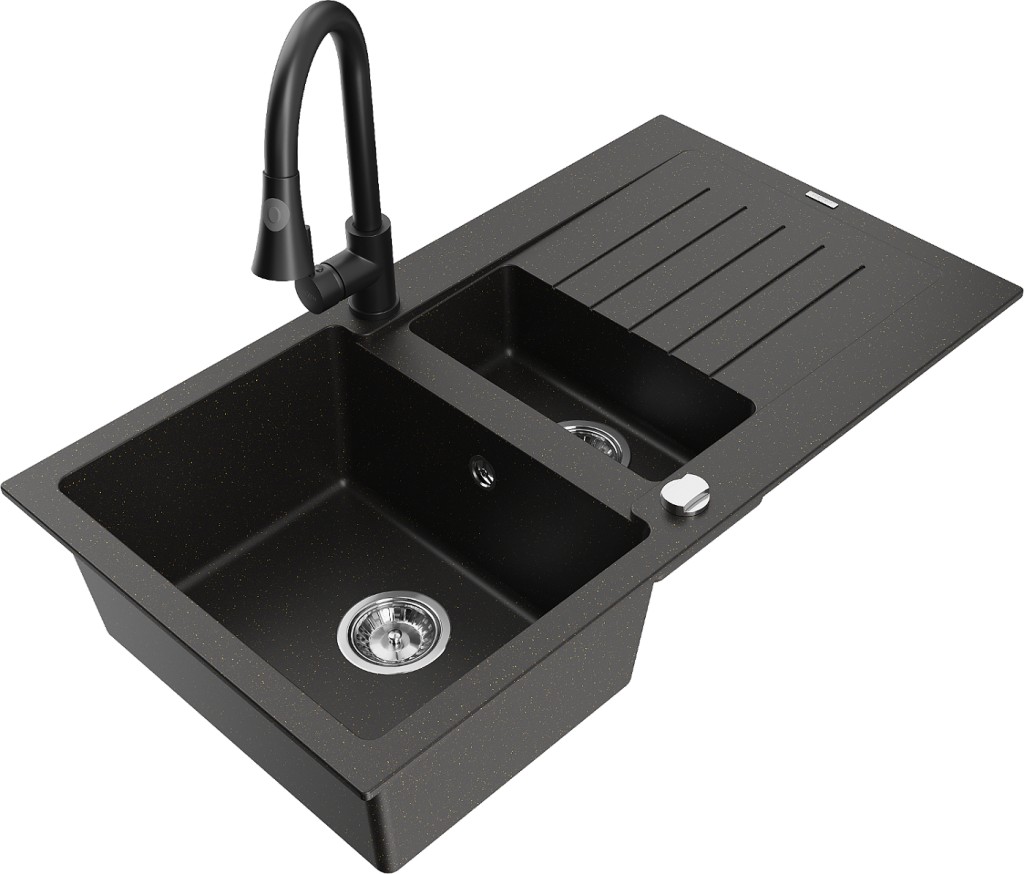 Technické dáta: drez: Rozmer: 900x505x200mm Hĺbka komory: 180 mm (väčšia), 115 mm (menšia) Rozmery komory: 435x335 mm (väčšie), 345x150 mm (menšie) Priemer odtoku: ø90 mm Typ: 1,5-miska s krátkym odkvapkávačom Typ: Zapustené do pracovnej dosky Farba: čierna / zlatá metalíza Povrchová úprava sifónu: Chrome Materiál: žula (80% žulové kamenivo, 20% živice) Prepadový otvor: Áno Otvory: (batérie, automatické) 2 Inštalácia: Univerzálna, je možné inštalovať s odkvapkávačom na ľavú alebo pravú stranu Vysoká odolnosť proti poškriabaniu a zmene farby Odolnosť proti tepelným šokom Ľahko čistiteľný povrch Dva dodatočné vyfrézované otvory na samodierovanie ø35 kuchynská batéria: Materiál: mosadz Čierna farba Hlava: Keramická Prevzdušňovač: Áno Typ: Jedna páka Výška batérie: 380 mm Rozsah výtoku: 252 mm Typ výtoku: Výsuvný(GT) Ean: 5905315027641