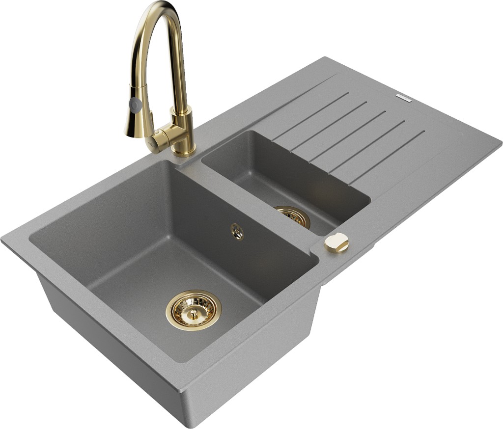 Technické dáta: drez: Rozmer: 900x505x200mm Hĺbka komory: 180 mm (väčšia), 115 mm (menšia) Rozmery komory: 435x335 mm (väčšie), 345x150 mm (menšie) Priemer odtoku: ø90 mm Typ: 1,5-miska s krátkym odkvapkávačom Typ: Zapustené do pracovnej dosky Šedá farba Povrchová úprava sifónu: zlatá Materiál: žula (80% žulové kamenivo, 20% živice) Prepadový otvor: Áno Otvory: (batérie, automatické) 2 Inštalácia: Univerzálna, je možné inštalovať s odkvapkávačom na ľavú alebo pravú stranu Vysoká odolnosť proti poškriabaniu a zmene farby Odolnosť proti tepelným šokom Ľahko čistiteľný povrch Dva dodatočné vyfrézované otvory na samodierovanie ø35 kuchynská batéria: Materiál: mosadz Farba: Zlatá Hlava: Keramická Prevzdušňovač: Áno Typ: Jedna páka Výška batérie: 380 mm Rozsah výtoku: 252 mm Typ výtoku: Výsuvný(GT) Ean: 5905315027535