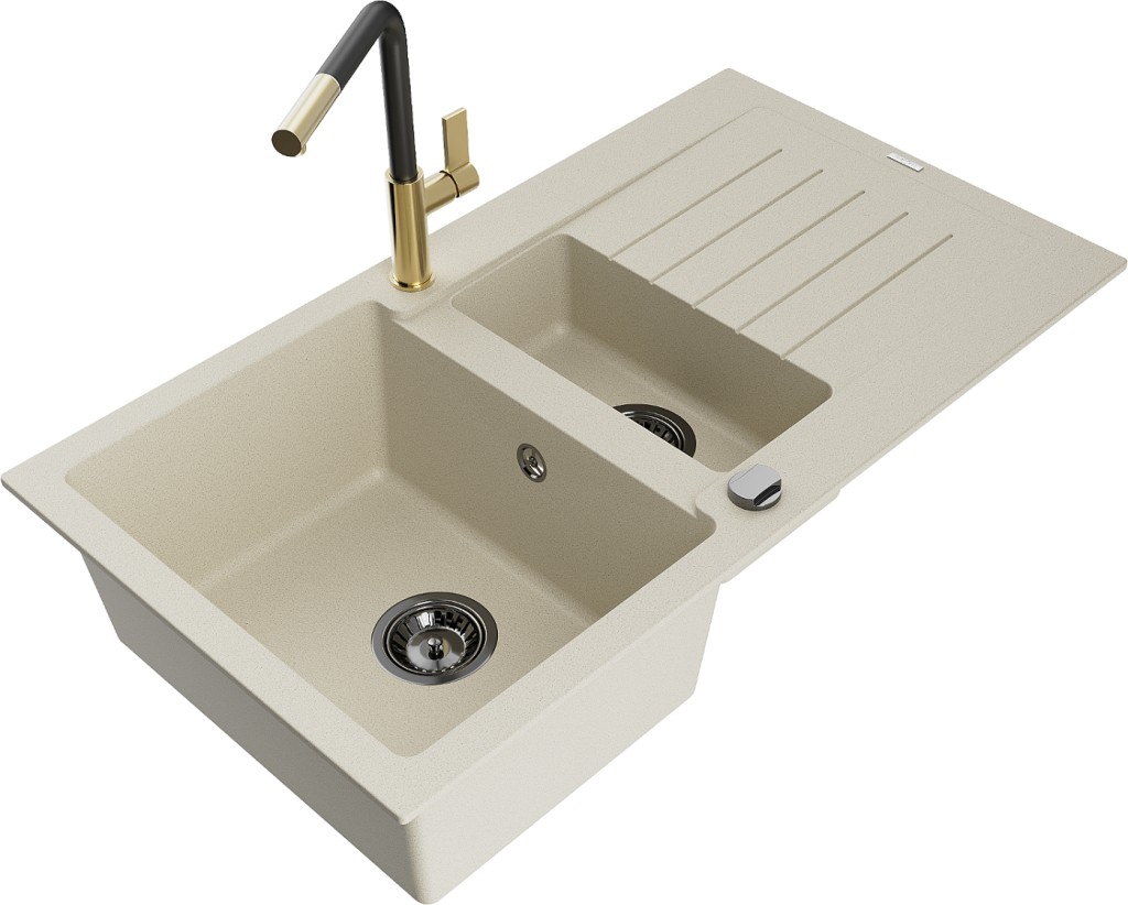 Technické dáta: drez: Rozmer: 900x505x200mm Hĺbka komory: 180 mm (väčšia), 115 mm (menšia) Rozmery komory: 435x335 mm (väčšie), 345x150 mm (menšie) Priemer odtoku: ø90 mm Typ: 1,5-komorový s krátkym odkvapkávačom Typ: Zapustené do pracovnej dosky Farba béžová Povrchová úprava sifónu: čierna Materiál: žula (80% žulové kamenivo, 20% živice) Prepadový otvor: Áno Otvory: (batérie, automatické) 2 Inštalácia: Univerzálna, je možné inštalovať s odkvapkávačom na ľavú alebo pravú stranu Vysoká odolnosť proti poškriabaniu a zmene farby Odolnosť proti tepelným šokom Ľahko čistiteľný povrch Dva dodatočné vyfrézované otvory na samodierovanie ø35 kuchynská batéria: Materiál: mosadz Farba: Zlatá/Čierna Hlava: Keramická Prevzdušňovač: Áno Typ: Jedna páka Rozsah výtoku: 245 mm Výška batérie: 307 mm(GT) Ean: 5905315056580