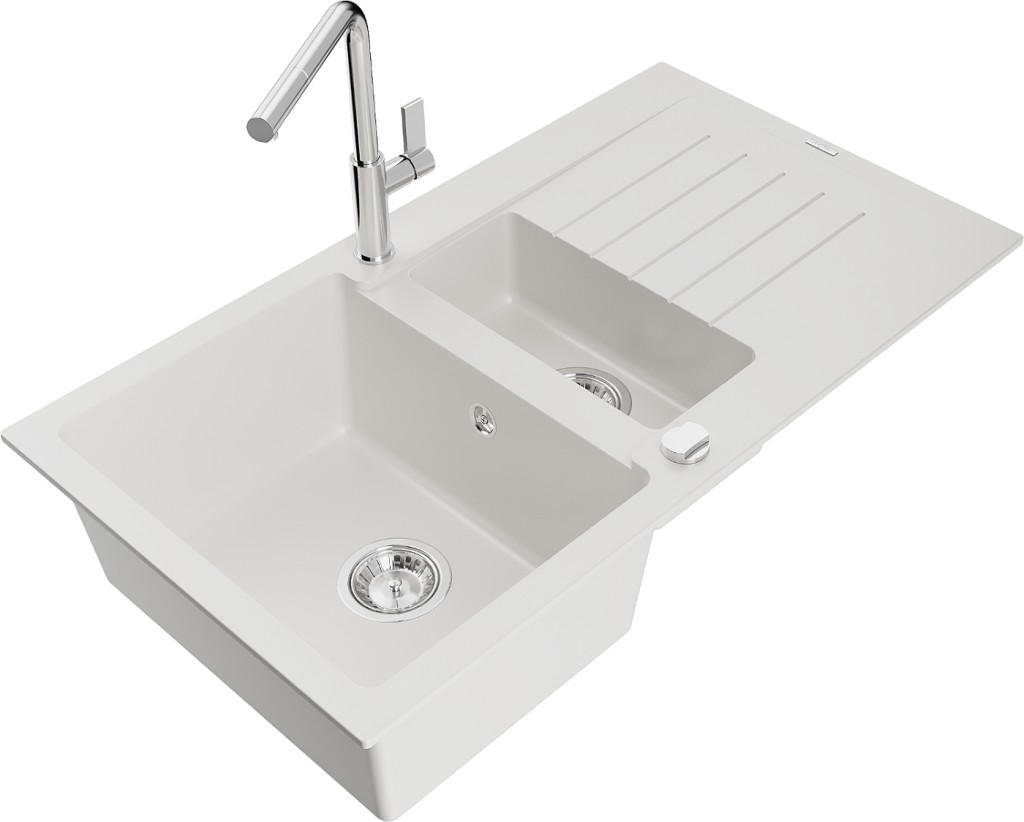 Technické dáta: drez: Rozmer: 900x505x200mm Hĺbka komory: 180 mm (väčšia), 115 mm (menšia) Rozmery komory: 435x335 mm (väčšie), 345x150 mm (menšie) Priemer odtoku: ø90 mm Typ: 1,5-komorový s krátkym odkvapkávačom Typ: Zapustené do pracovnej dosky biela farba Povrchová úprava sifónu: Chrome Materiál: žula (80% žulové kamenivo, 20% živice) Prepadový otvor: Áno Otvory: (batérie, automatické) 2 Inštalácia: Univerzálna, je možné inštalovať s odkvapkávačom na ľavú alebo pravú stranu Vysoká odolnosť proti poškriabaniu a zmene farby Odolnosť proti tepelným šokom Ľahko čistiteľný povrch Dva dodatočné vyfrézované otvory na samodierovanie ø35 kuchynská batéria: Materiál: mosadz Farba: Chrome Hlava: Keramická Prevzdušňovač: Áno Typ: Jedna páka Rozsah výtoku: 245 mm Výška batérie: 307 mm(GT) Ean: 5905315056450