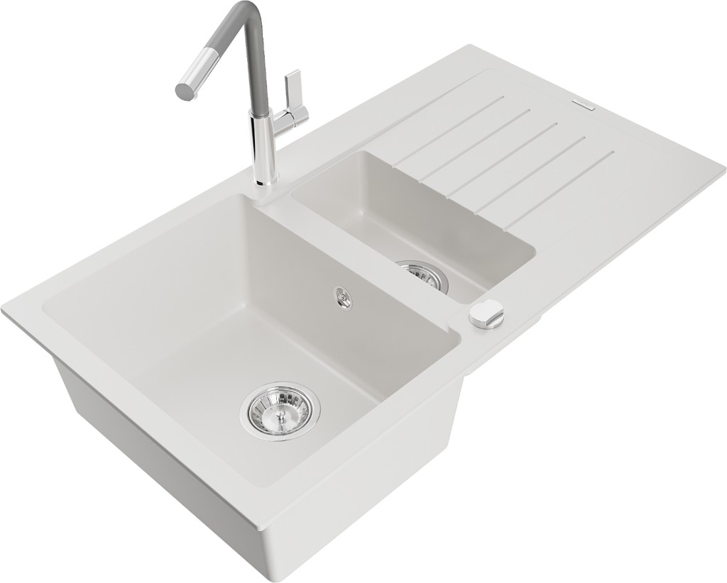 Technické dáta: drez: Rozmer: 900x505x200mm Hĺbka komory: 180 mm (väčšia), 115 mm (menšia) Rozmery komory: 435x335 mm (väčšie), 345x150 mm (menšie) Priemer odtoku: ø90 mm Typ: 1,5-komorový s krátkym odkvapkávačom Typ: Zapustené do pracovnej dosky biela farba Povrchová úprava sifónu: Chrome Materiál: žula (80% žulové kamenivo, 20% živice) Prepadový otvor: Áno Otvory: (batérie, automatické) 2 Inštalácia: Univerzálna, je možné inštalovať s odkvapkávačom na ľavú alebo pravú stranu Vysoká odolnosť proti poškriabaniu a zmene farby Odolnosť proti tepelným šokom Ľahko čistiteľný povrch Dva dodatočné vyfrézované otvory na samodierovanie ø35 kuchynská batéria: Materiál: mosadz Farba: chróm/sivá Hlava: Keramická Prevzdušňovač: Áno Typ: Jedna páka Rozsah výtoku: 245 mm Výška batérie: 307 mm(GT) Ean: 5905315056474