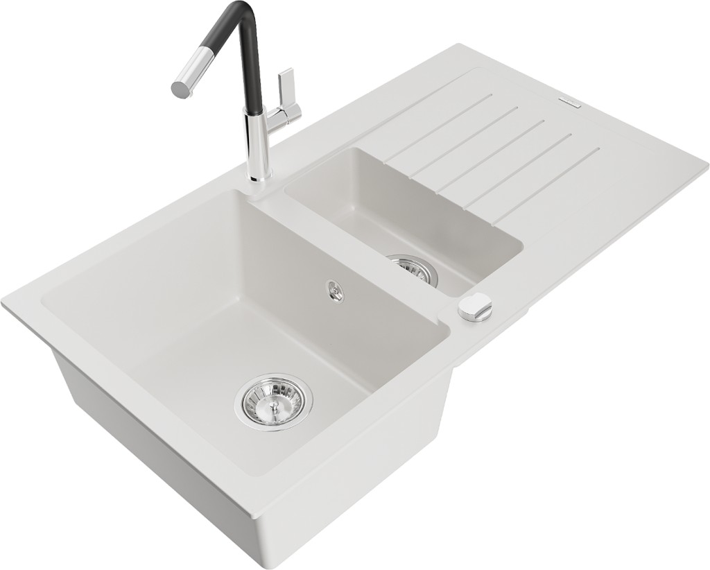 Technické dáta: drez: Rozmer: 900x505x200mm Hĺbka komory: 180 mm (väčšia), 115 mm (menšia) Rozmery komory: 435x335 mm (väčšie), 345x150 mm (menšie) Priemer odtoku: ø90 mm Typ: 1,5-komorový s krátkym odkvapkávačom Typ: Zapustené do pracovnej dosky biela farba Povrchová úprava sifónu: Chrome Materiál: žula (80% žulové kamenivo, 20% živice) Prepadový otvor: Áno Otvory: (batérie, automatické) 2 Inštalácia: Univerzálna, je možné inštalovať s odkvapkávačom na ľavú alebo pravú stranu Vysoká odolnosť proti poškriabaniu a zmene farby Odolnosť proti tepelným šokom Ľahko čistiteľný povrch Dva dodatočné vyfrézované otvory na samodierovanie ø35 kuchynská batéria: Materiál: mosadz Farba: chróm/čierna Hlava: Keramická Prevzdušňovač: Áno Typ: Jedna páka Rozsah výtoku: 245 mm Výška batérie: 307 mm(GT) Ean: 5905315056481