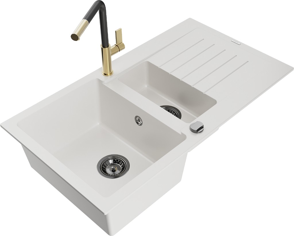 Technické dáta: drez: Rozmer: 900x505x200mm Hĺbka komory: 180 mm (väčšia), 115 mm (menšia) Rozmery komory: 435x335 mm (väčšie), 345x150 mm (menšie) Priemer odtoku: ø90 mm Typ: 1,5-komorový s krátkym odkvapkávačom Typ: Zapustené do pracovnej dosky biela farba Povrchová úprava sifónu: čierna Materiál: žula (80% žulové kamenivo, 20% živice) Prepadový otvor: Áno Otvory: (batérie, automatické) 2 Inštalácia: Univerzálna, je možné inštalovať s odkvapkávačom na ľavú alebo pravú stranu Vysoká odolnosť proti poškriabaniu a zmene farby Odolnosť proti tepelným šokom Ľahko čistiteľný povrch Dva dodatočné vyfrézované otvory na samodierovanie ø35 kuchynská batéria: Materiál: mosadz Farba: Zlatá/Čierna Hlava: Keramická Prevzdušňovač: Áno Typ: Jedna páka Rozsah výtoku: 245 mm Výška batérie: 307 mm(GT) Ean: 5905315056511