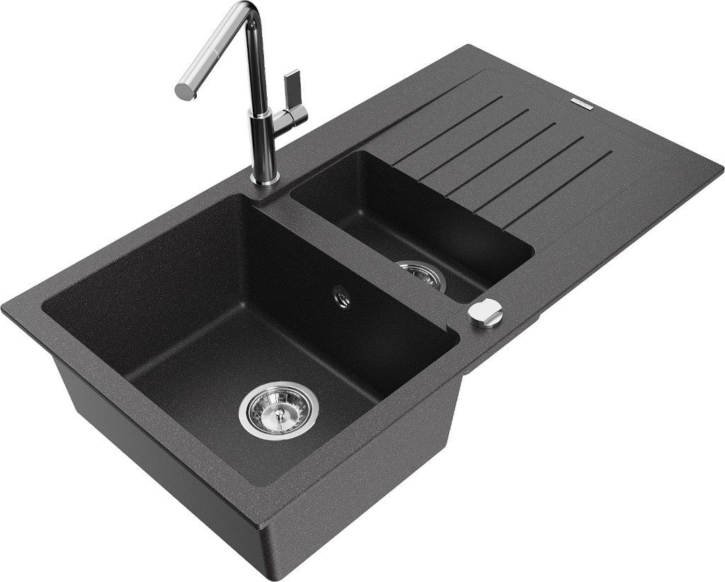 Technické dáta: drez: Rozmer: 900x505x200mm Hĺbka komory: 180 mm (väčšia), 115 mm (menšia) Rozmery komory: 435x335 mm (väčšie), 345x150 mm (menšie) Priemer odtoku: ø90 mm Typ: 1,5-miska s krátkym odkvapkávačom Typ: Zapustené do pracovnej dosky Farba: Škvrnitá čierna Povrchová úprava sifónu: Chrome Materiál: žula (80% žulové kamenivo, 20% živice) Prepadový otvor: Áno Otvory: (batérie, automatické) 2 Inštalácia: Univerzálna, je možné inštalovať s odkvapkávačom na ľavú alebo pravú stranu Vysoká odolnosť proti poškriabaniu a zmene farby Odolnosť proti tepelným šokom Ľahko čistiteľný povrch Dva dodatočné vyfrézované otvory na samodierovanie ø35 kuchynská batéria: Materiál: mosadz Farba: Chrome Hlava: Keramická Prevzdušňovač: Áno Typ: Jedna páka Rozsah výtoku: 245 mm Výška batérie: 307 mm(GT) Ean: 5905315056795